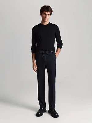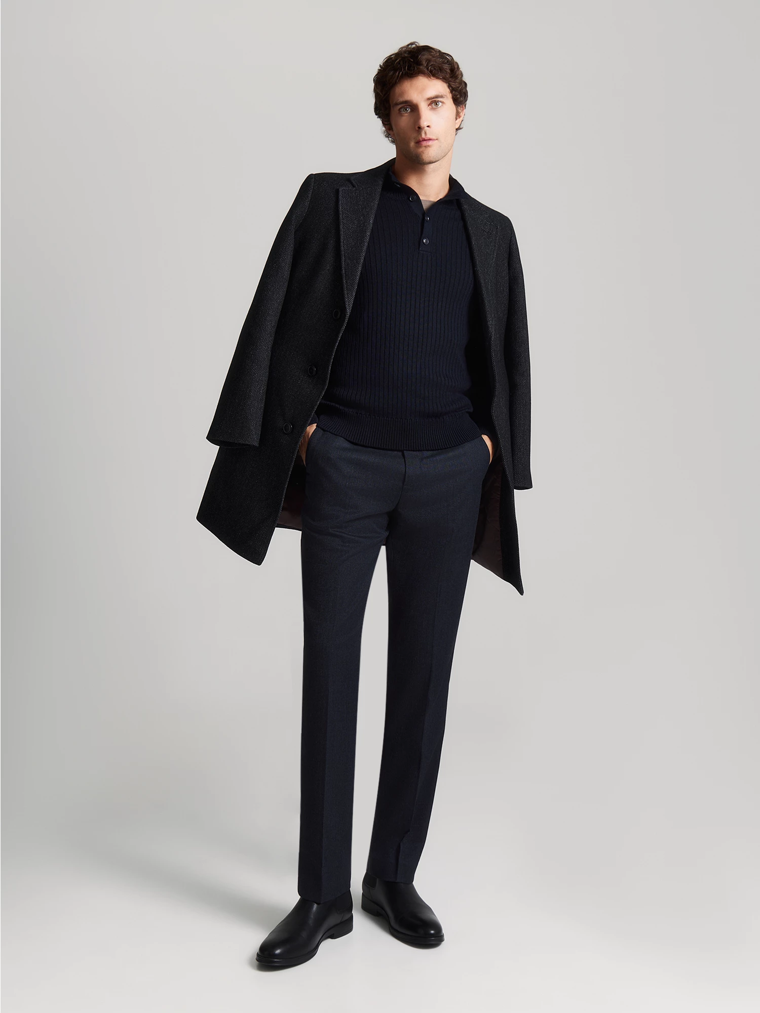 Вязаный джемпер полуприлегающего силуэта с длинным рукавом и воротником-полустойкой с застежкой на планку и пуговицы. Модель в спокойном темно-синем выполнена в технике рибана из премиальной итальянской пряжи, состоящей из шерсти мериноса и мягкого акрила. Вязаные изделия из шерсти мериноса обеспечивают комфортную температуру для тела, хорошо тянутся и не сковывают движения. Акрил гипоаллергенен, хорошо держит цвет и практически не мнется. Такие качества двух волокон прекрасно дополняют друг друга. Процесс вязки происходит на японской плосковязальной машине Shima Seiki. Все соединительные швы выполнены на кеттельном оборудовании. Это премиальная, дорогая обработка, позволяющая создавать эластичное, практически незаметное соединение. Стильный теплый свитер с застежкой на воротнике будет востребован как офисный, деловой, повседневный.