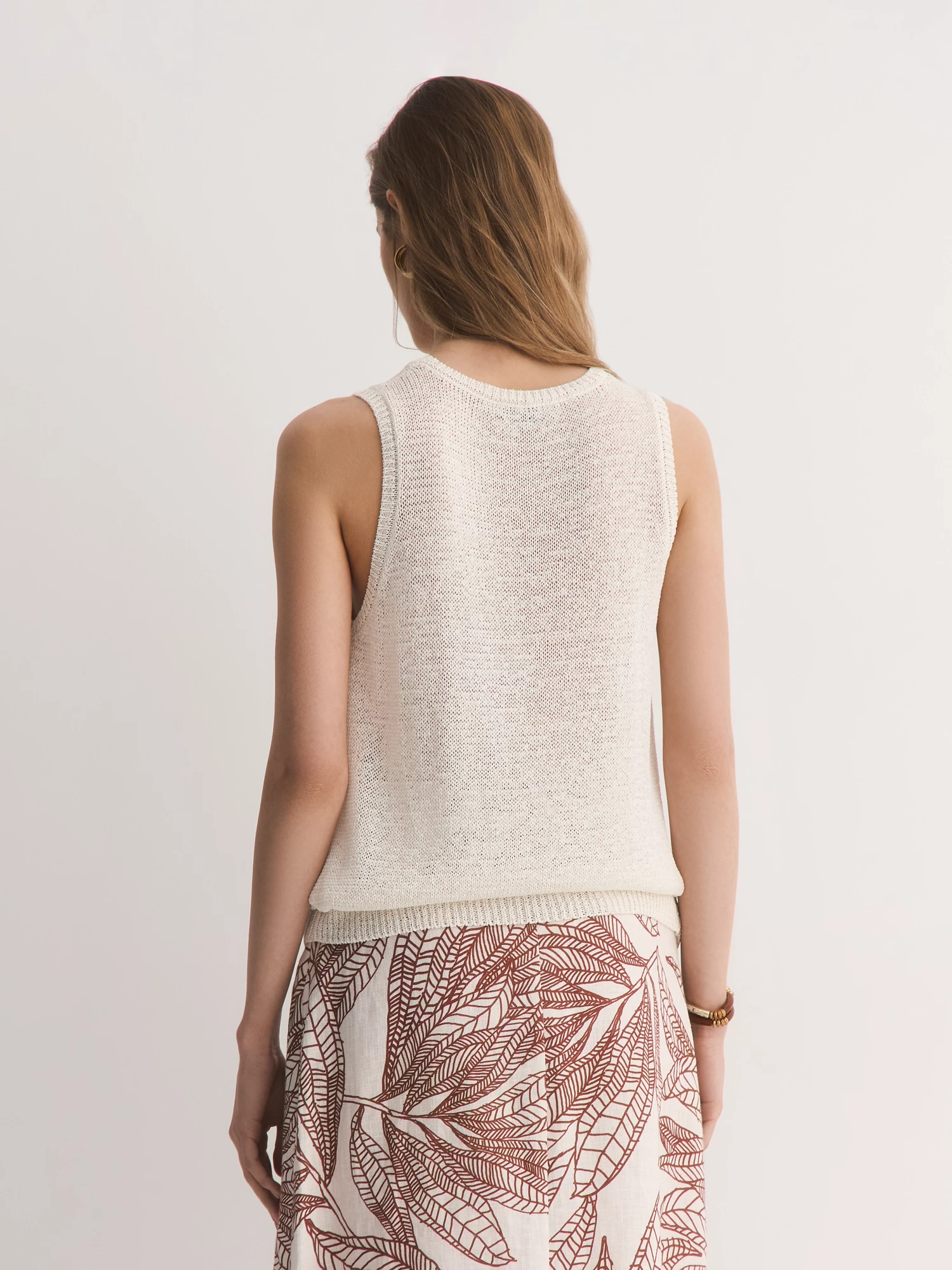 Топ связан из особой ленточной пряжи на основе льна и хлопка с добавлением нейлона. Лен дарит натуральность, прочность и отличную воздухопроницаемость, хлопок делает его мягким и комфортным, а нейлон добавляет эластичность, чтобы топ не терял форму.