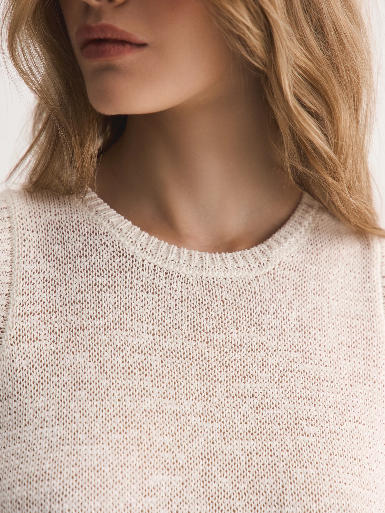 Прямой крой и круглая горловина подчеркивают лаконичность модели, а отсутствие рукавов делает ее универсальной для любого сезона. Молочный оттенок легко сочетается с любыми цветами, будь то классические джинсы, юбки или яркие акцентные вещи.