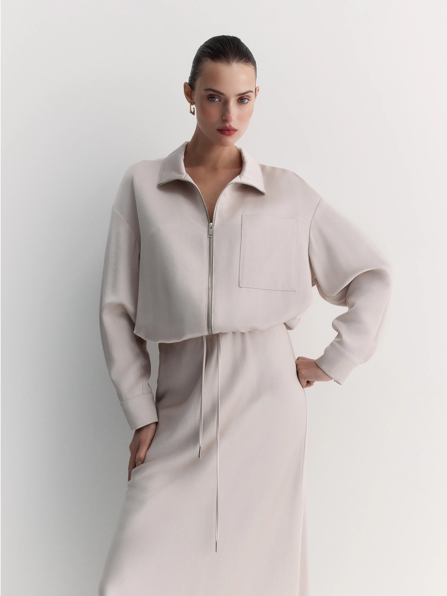 Фиксация на талии с помощью круглого шнура обеспечивает удобную посадку и подчеркивает силуэт. Нежный молочный цвет с розовым подтоном добавляет образу романтичности.