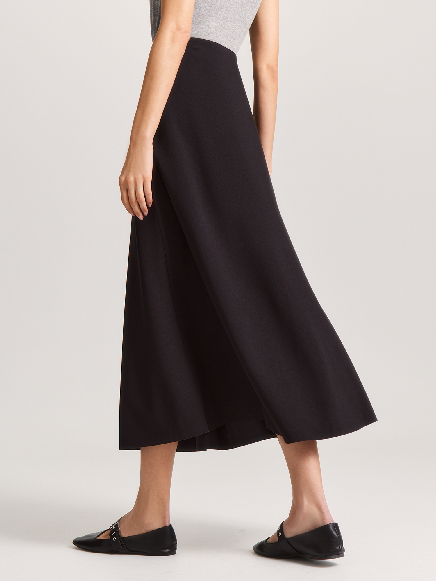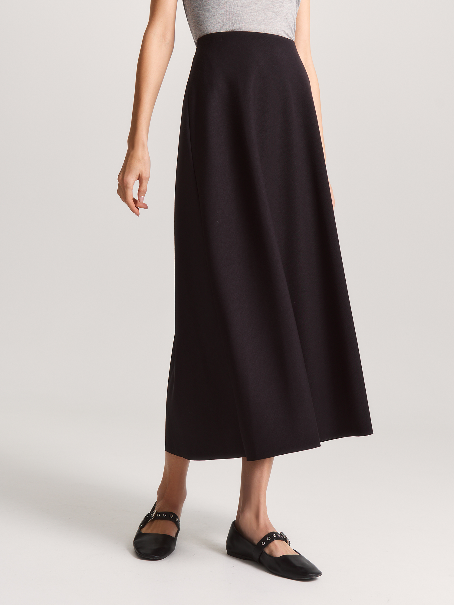 Юбка комфортного А-силуэта в базовом черном незаменима для повседневной носки. Модель выполнена с плавным расклешением, без притачного пояса, на резинке по талии с изнаночной стороны.