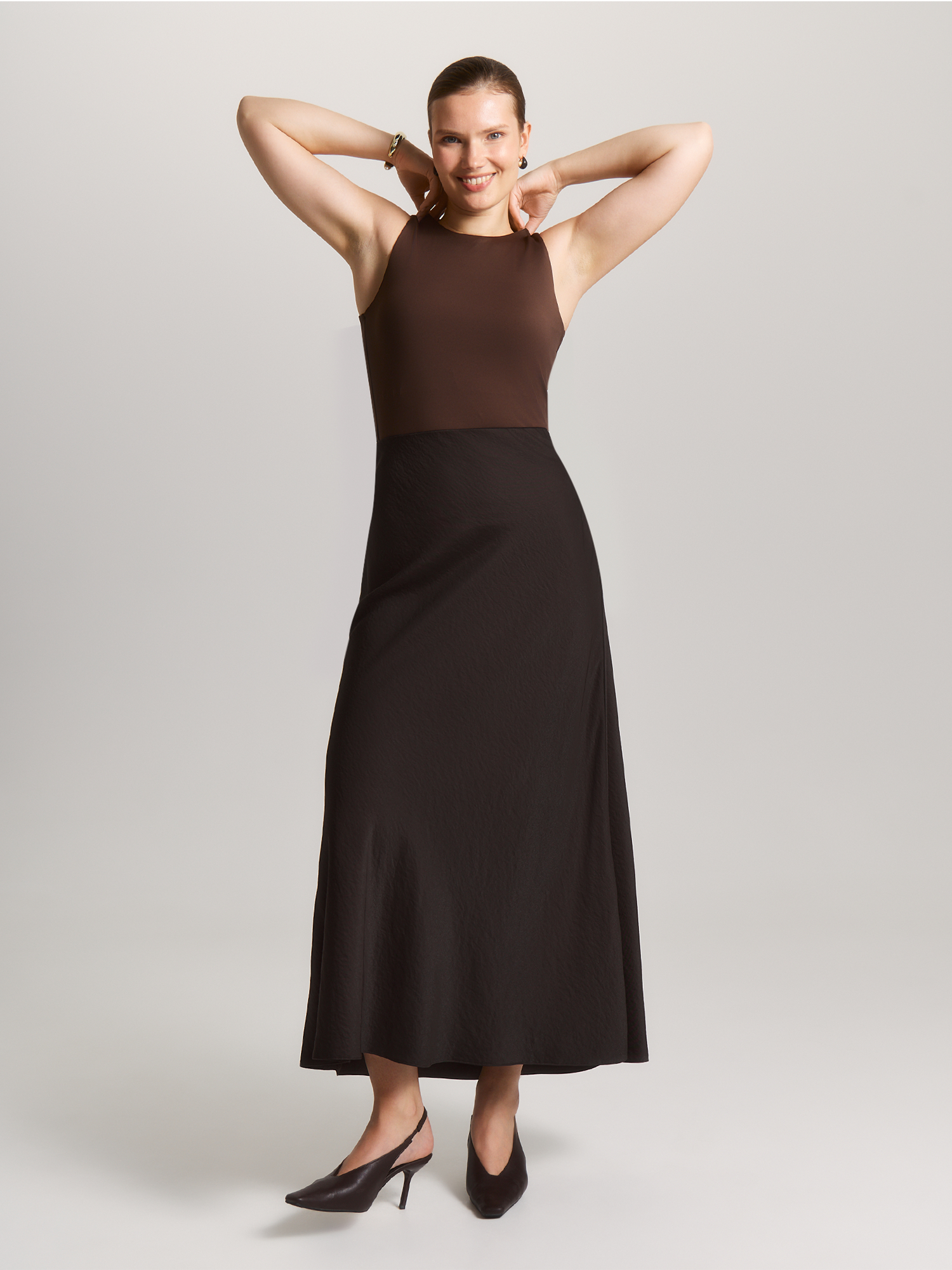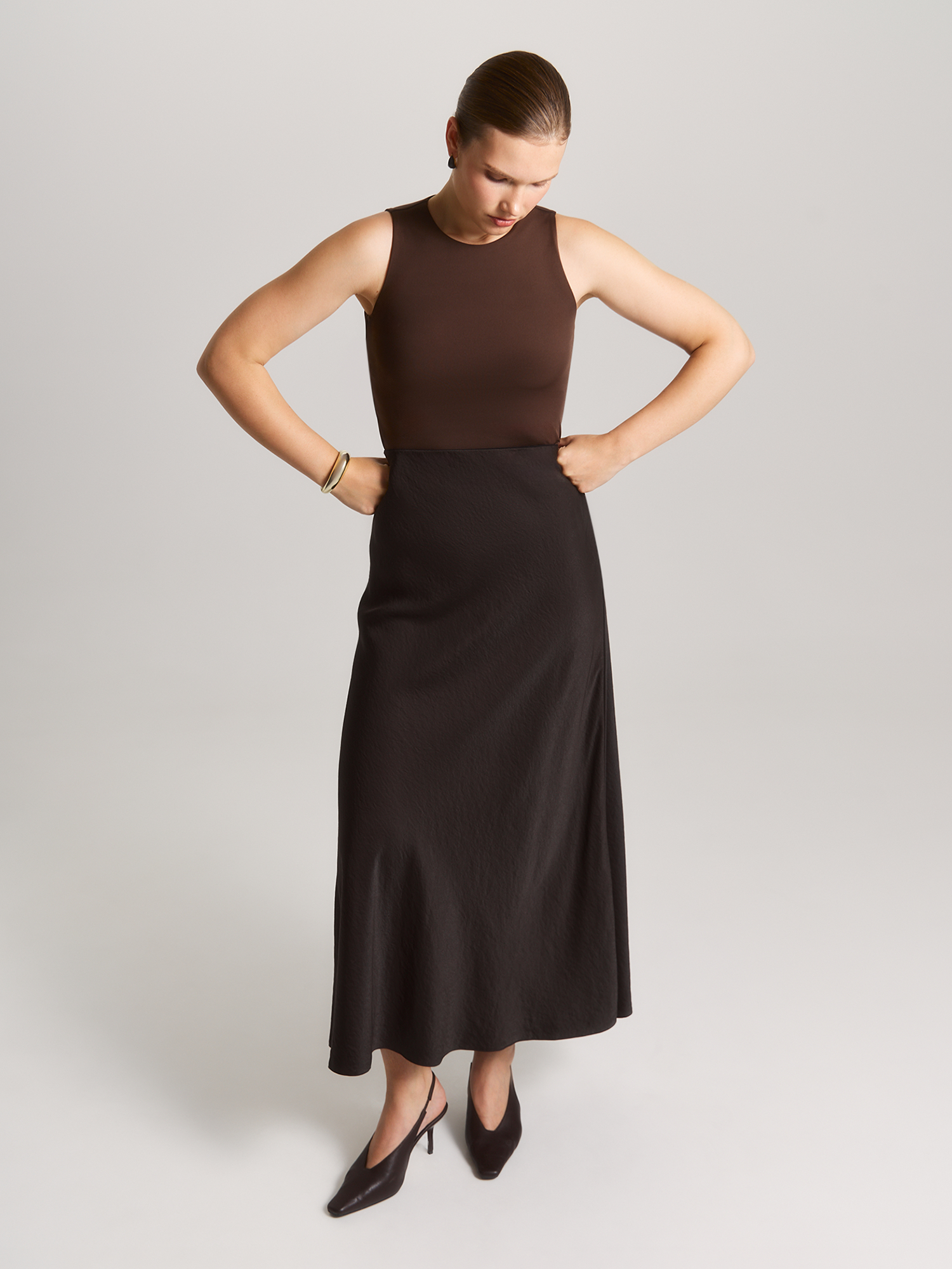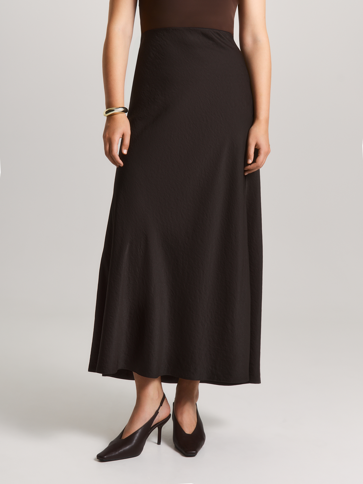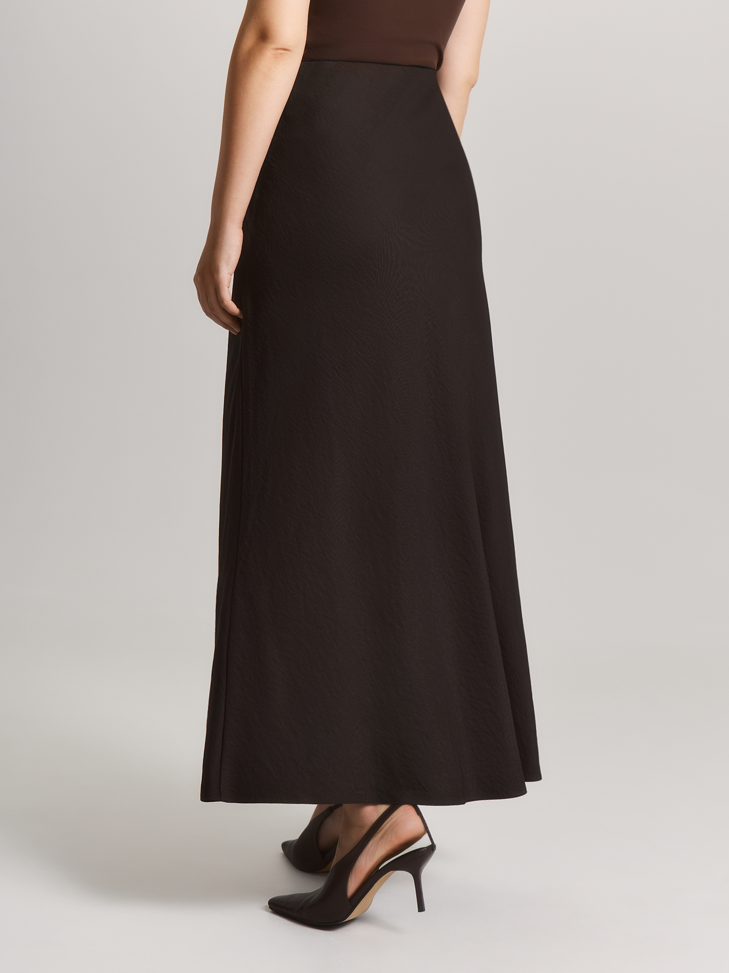 Юбка-трапеция с изысканным кроем – воплощение современного комфорта и элегантной простоты, созданная для тех, кто ценит в одежде удобство и универсальность. Модель составит гармоничный образ с блузой BL159875 из такой же ткани. Свободный силуэт юбки, плавно расширяющийся от талии, создает воздушный и женственный образ, одновременно обеспечивая полную свободу движений. Внутренняя резинка по линии талии – гениальное решение, которое обеспечивает идеальную посадку без сдавливания, подстраиваясь под нюансы фигуры, в то время как отсутствие притачного пояса делает силуэт особенно мягким и непринужденным. Потайная молния сбоку добавляет модели аккуратности и удобства при надевании, сохраняя чистоту линий и визуальную лаконичность. Выполненная из высококачественной смесовой ткани с легким эффектом крэш, юбка сочетает лучшие свойства материалов: нежная вискоза дарит коже приятные тактильные ощущения, полиэстер обеспечивает износостойкость, а нейлон добавляет благородный блеск и прочность. Этот умный состав делает модель идеальным выбором для осенне-зимнего периода. Глубокий оттенок "ганаш" — насыщенный темно-коричневый, как изысканный шоколадный десерт, — придает образу благородную глубину и теплоту. Этот цвет одинаково органично смотрится как в строгом деловом ансамбле, так и в вечернем луке, делая модель по-настоящему универсальной. Такая юбка — ваш надежный спутник в самых разных ситуациях. Она легко трансформируется из офисного варианта в нарядный вечерний — достаточно дополнить её соответствующими аксессуарами. В деловом образе она продемонстрирует ваш профессионализм, в повседневном — подчеркнет безупречный вкус, а в новогоднем ансамбле добавит ноту изысканности.