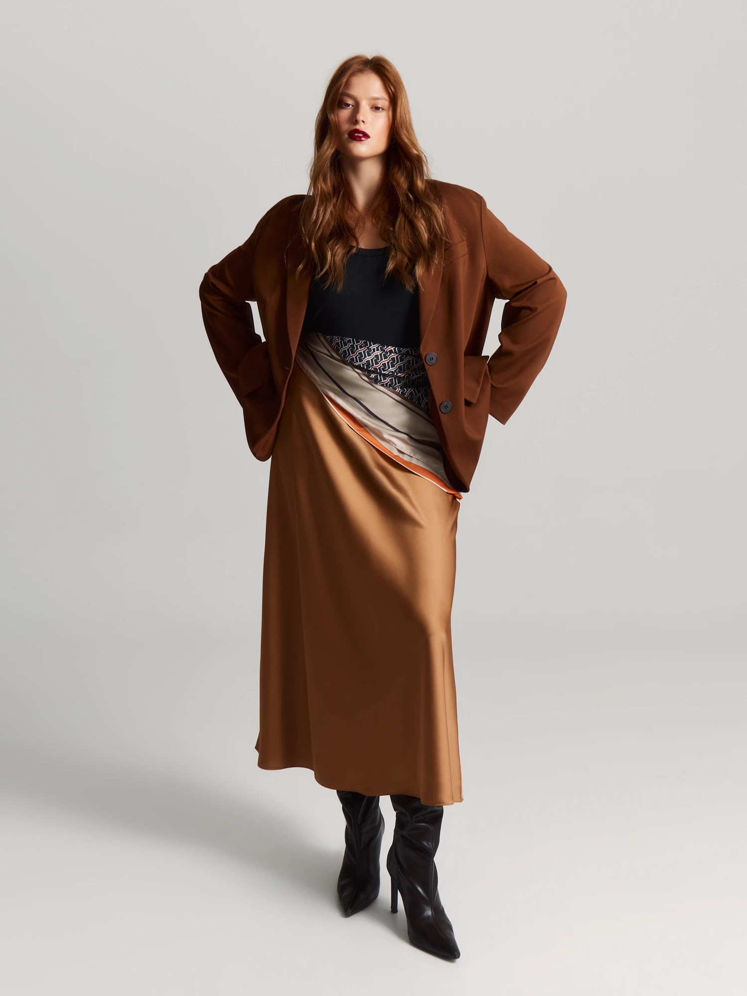 Универсальный фасон делает юбку идеальной для офиса, праздничных мероприятий или повседневной носки, а оттенок тростникового сахара с пряным горчичным подтоном прекрасно сочетается с цветами из осенне-зимней палитры.