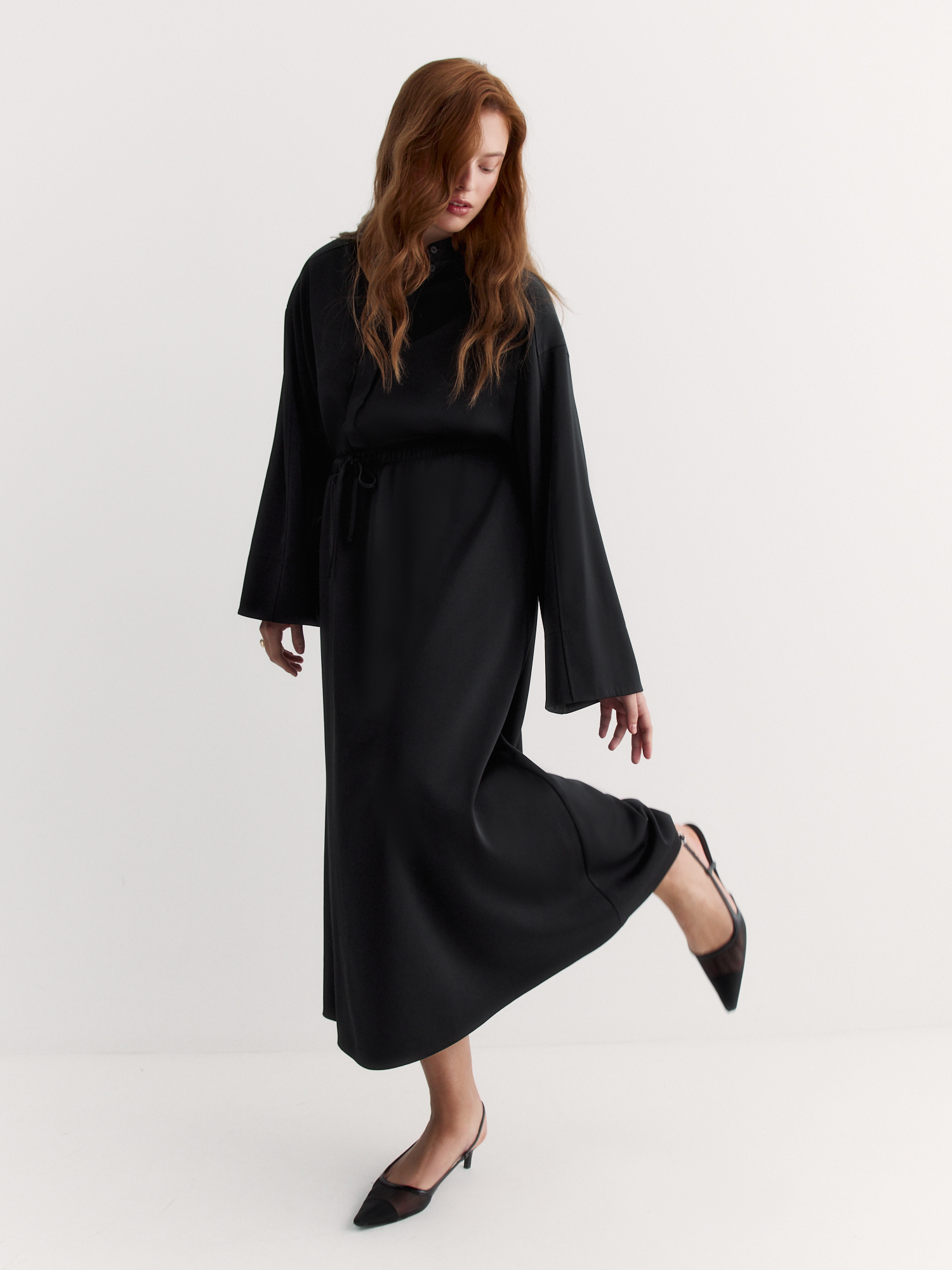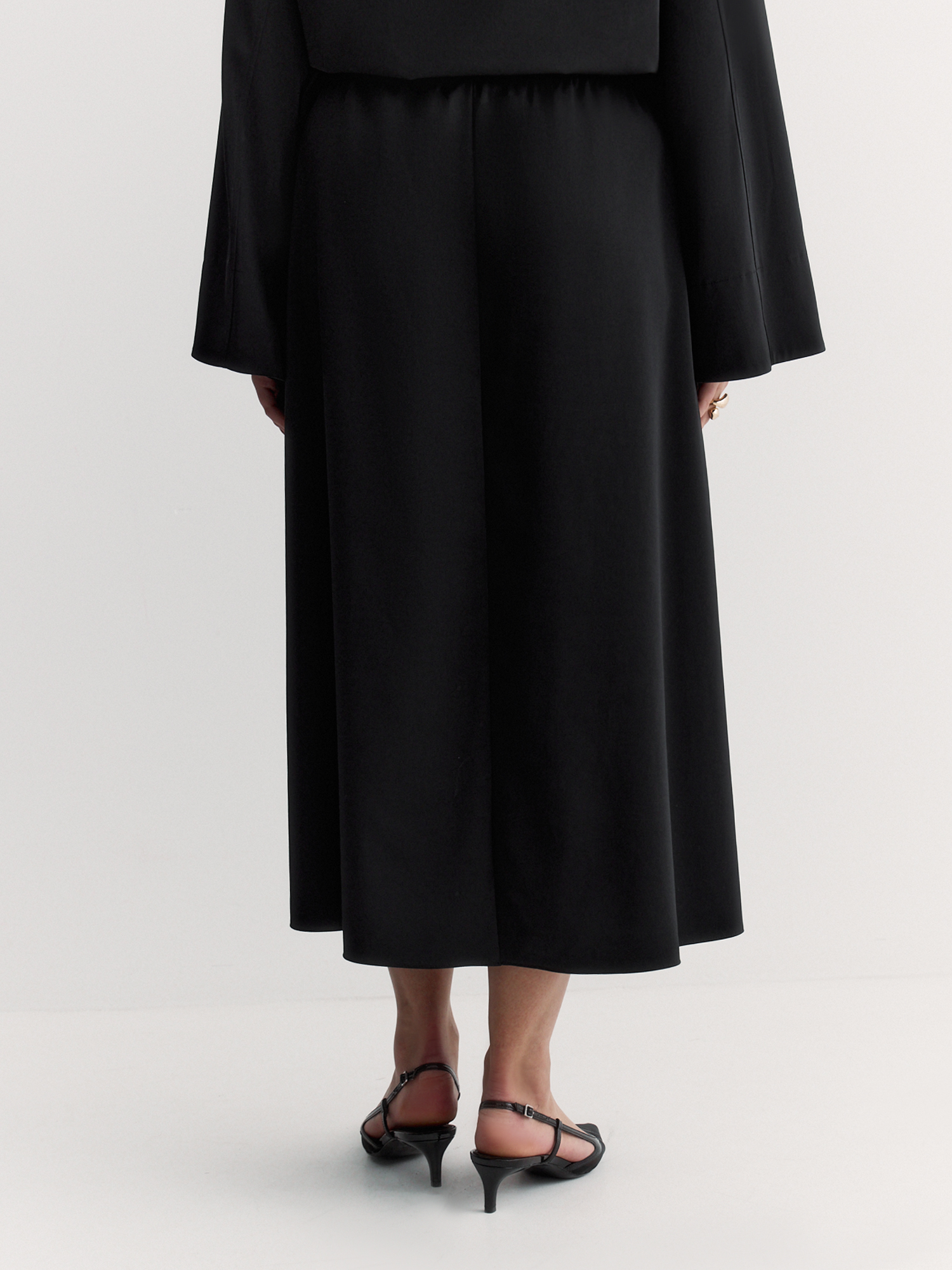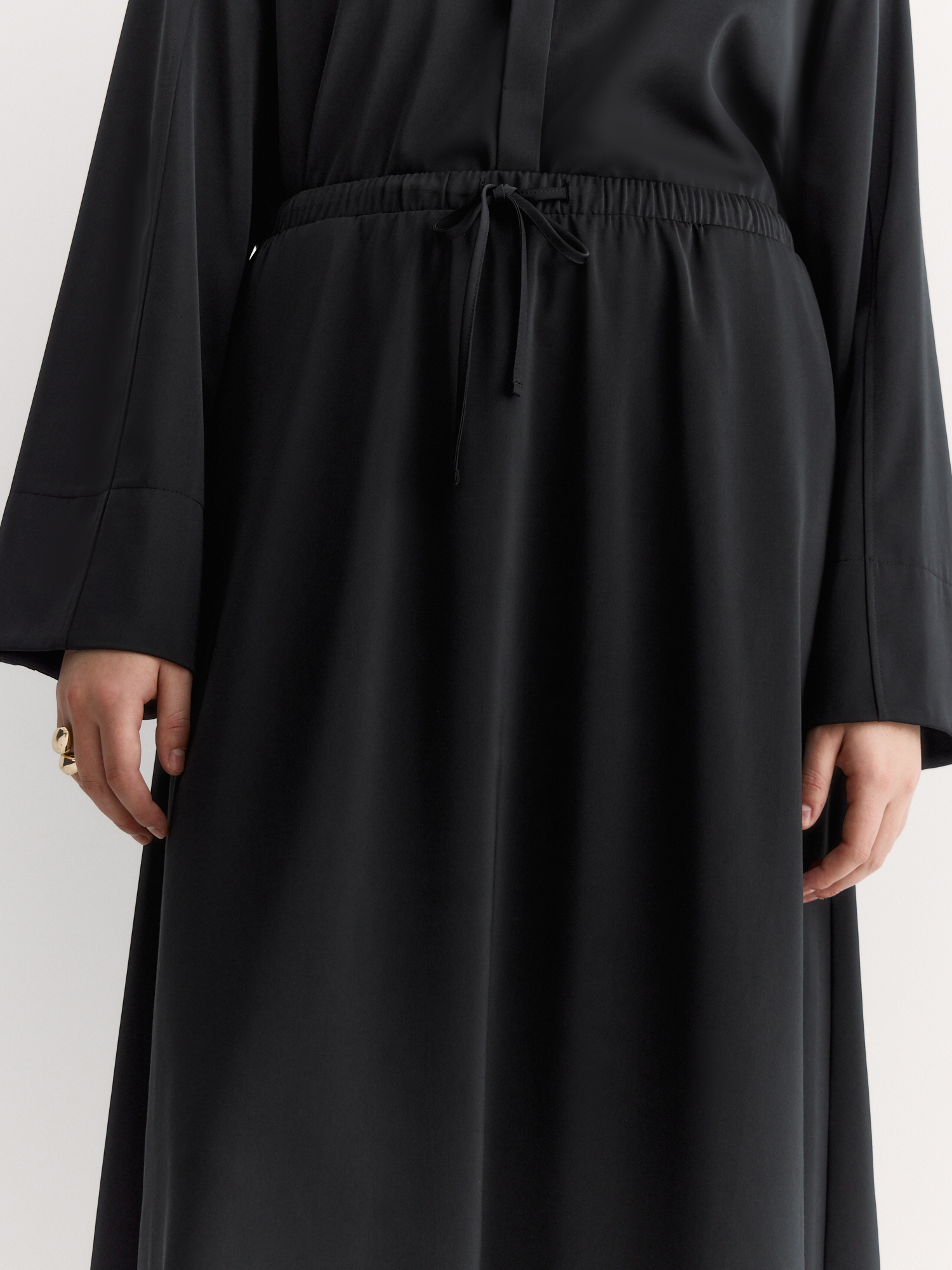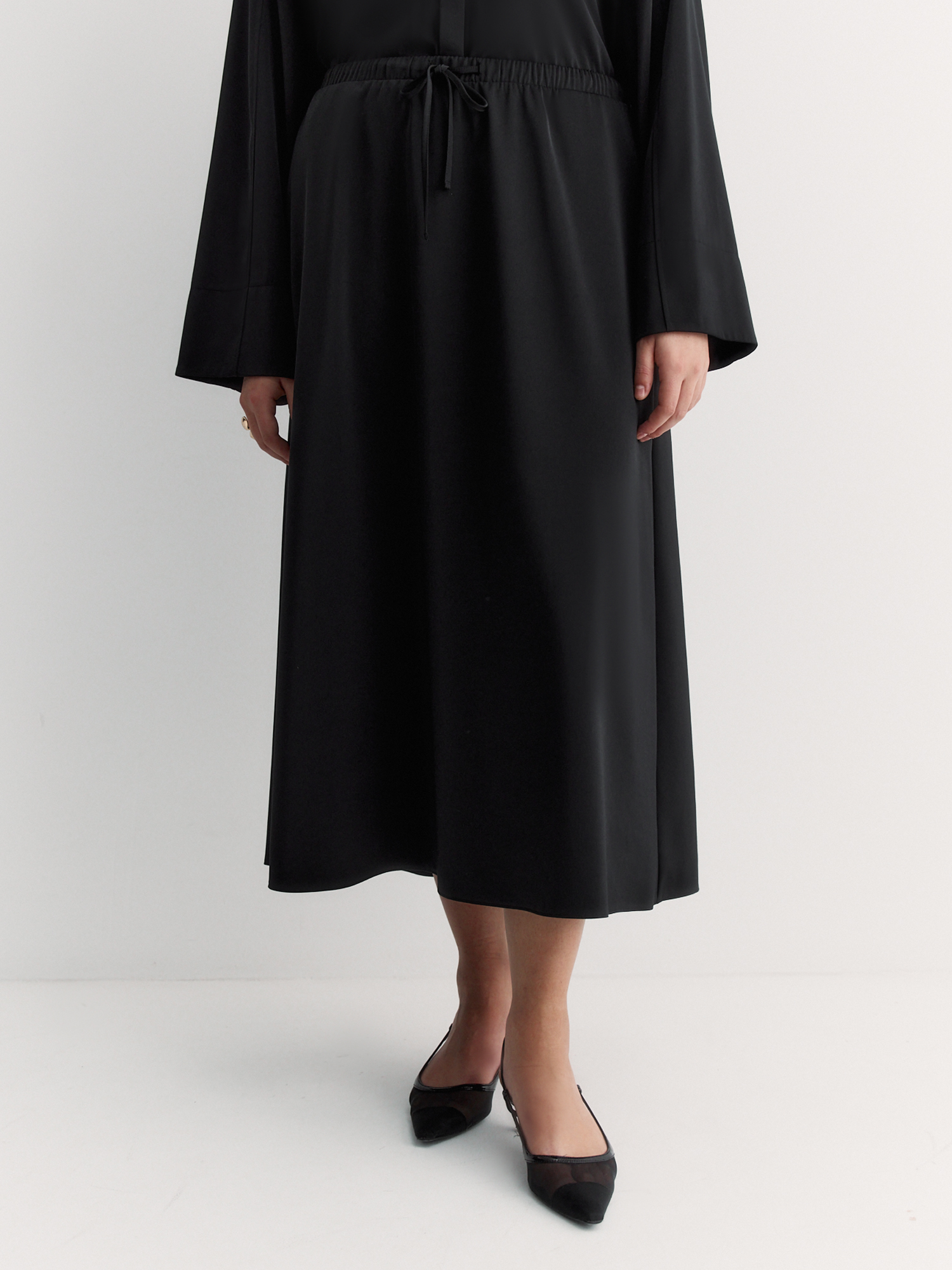 Резинка и шнур по талии обеспечивают идеальную посадку и комфорт в течение всего дня. Расклешенный крой создаёт элегантный силуэт, который подчеркивает женственность.