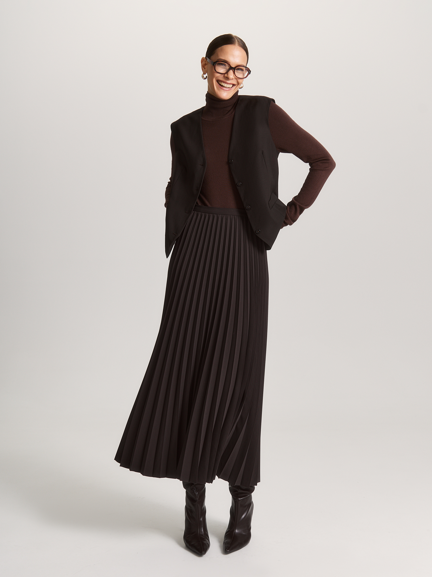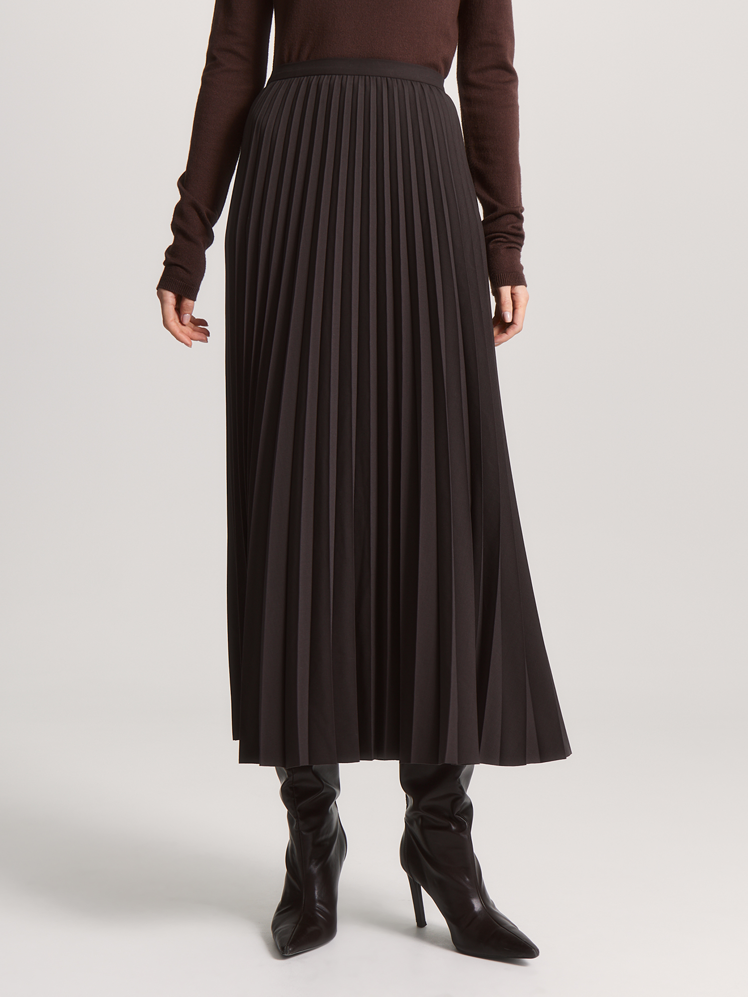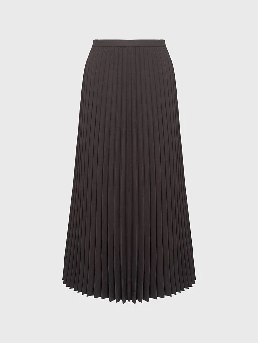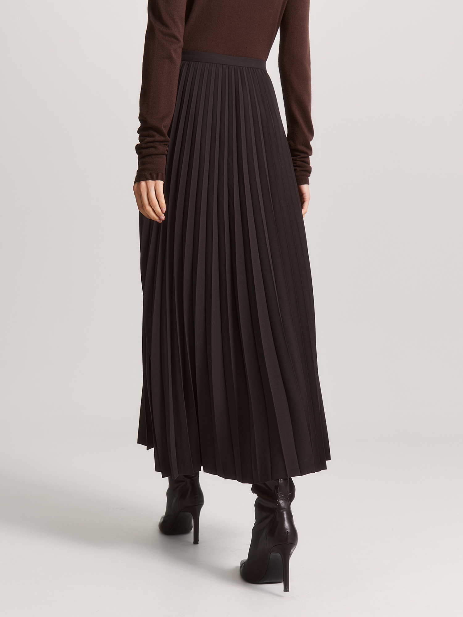 Юбка с радиальным гофре, выполненным на ткани из качественной поливискозы в насыщенном шоколадном оттенке. Операция "гофре" выполнена с помощью специального оборудования на собственном производстве полного цикла. Модель хорошо подчеркивает талию, так как выполнена на притачном поясе с застежкой на потайную молнию сбоку. Геометрически верное, радиальное гофре с расширяющимися книзу складками гарантирует правильное расклешение и не увеличивает бедра.