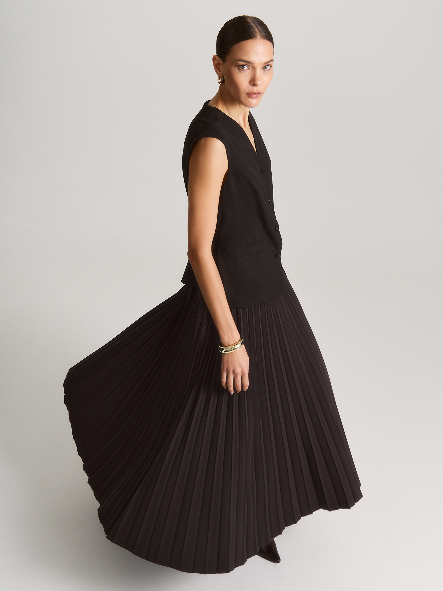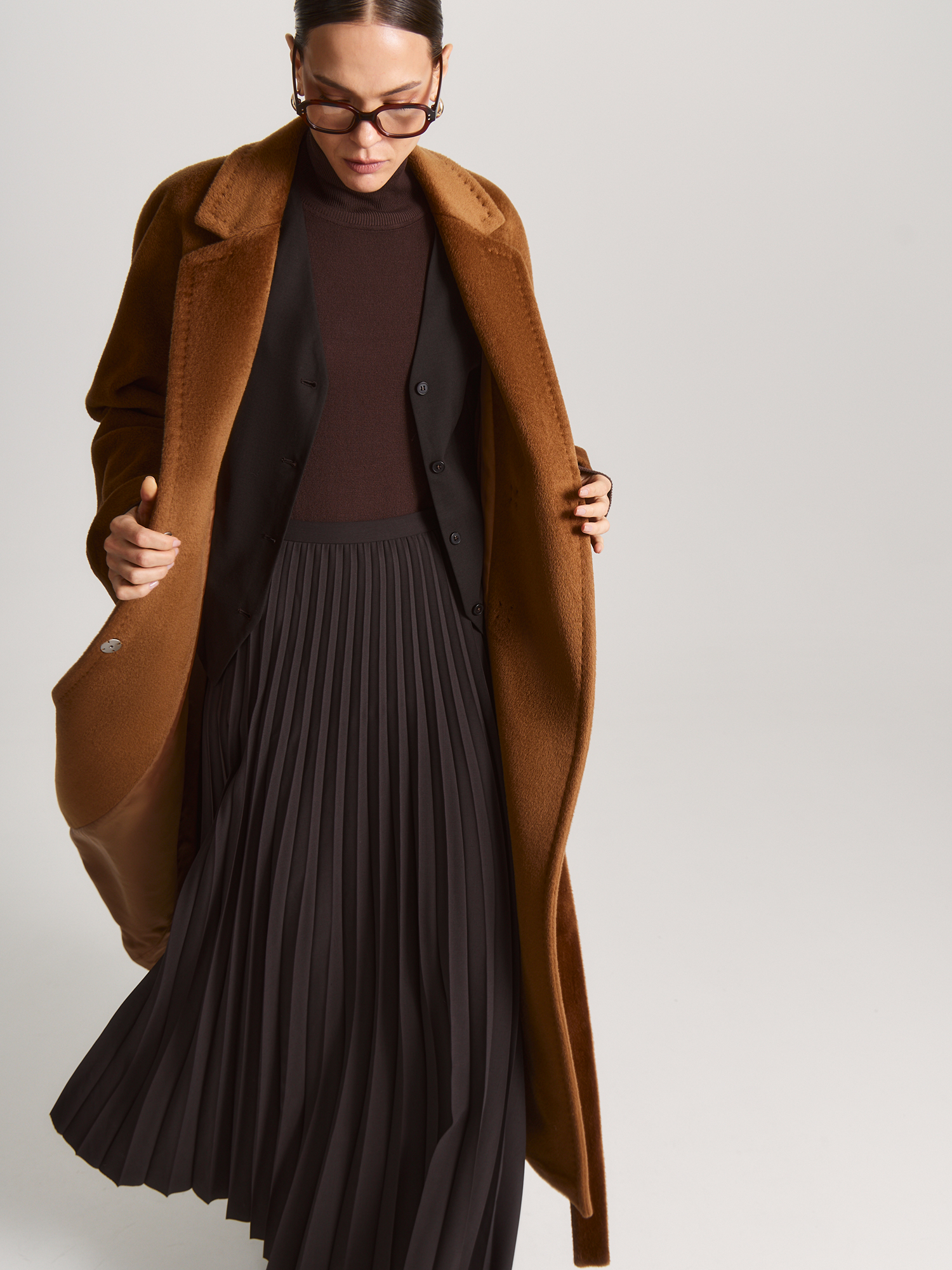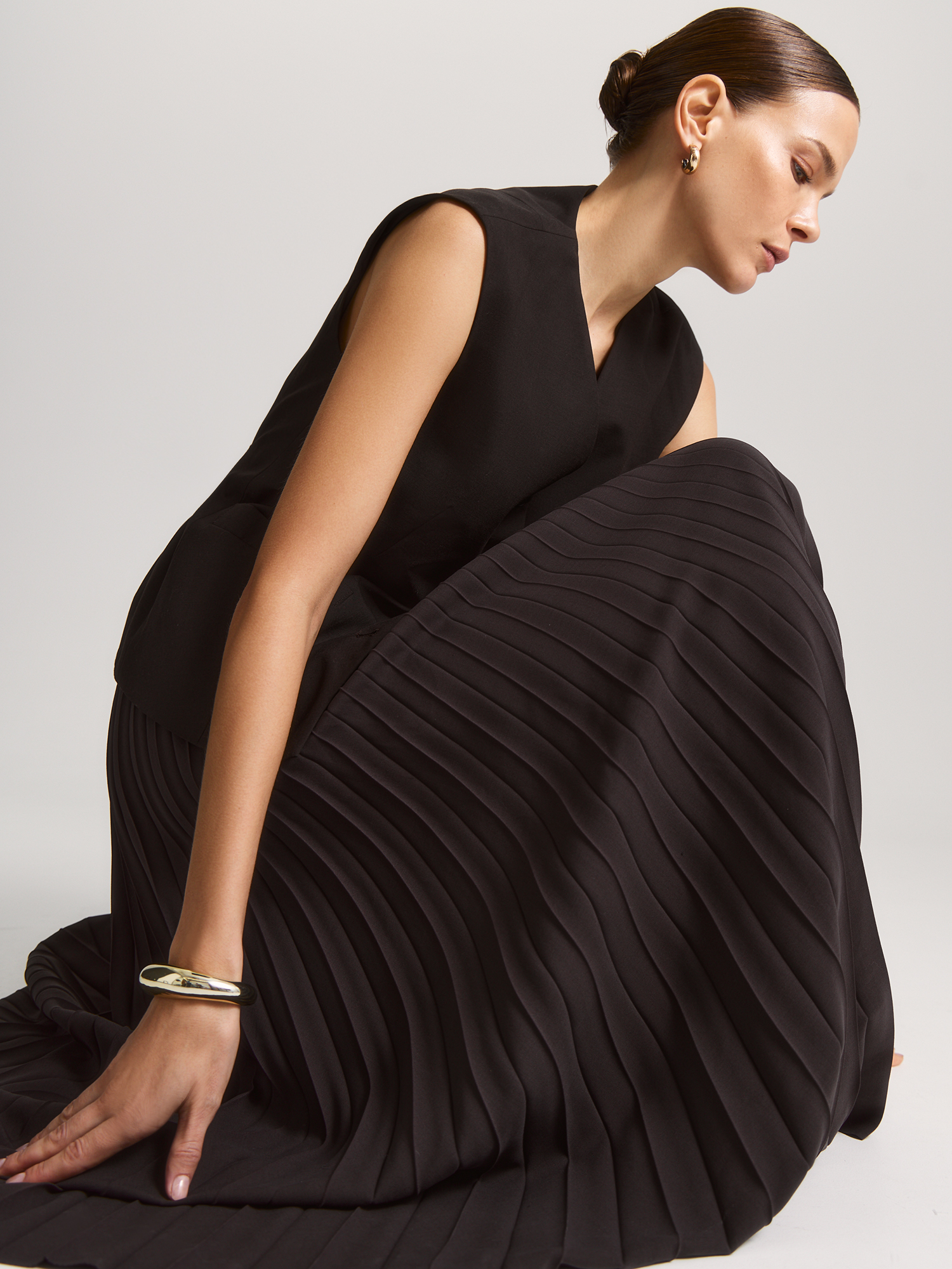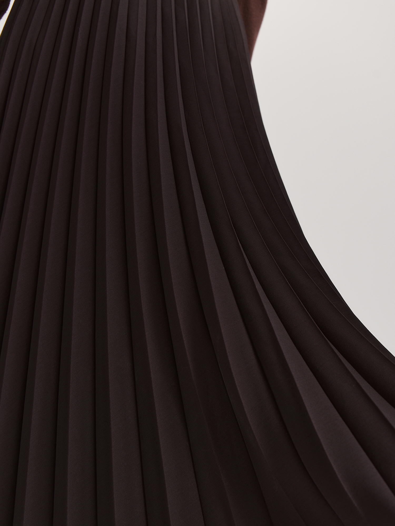 Юбка с радиальным гофре, выполненным на ткани из качественной поливискозы в насыщенном шоколадном оттенке. Операция "гофре" выполнена с помощью специального оборудования на собственном производстве полного цикла. Модель хорошо подчеркивает талию, так как выполнена на притачном поясе с застежкой на потайную молнию сбоку. Геометрически верное, радиальное гофре с расширяющимися книзу складками гарантирует правильное расклешение и не увеличивает бедра.