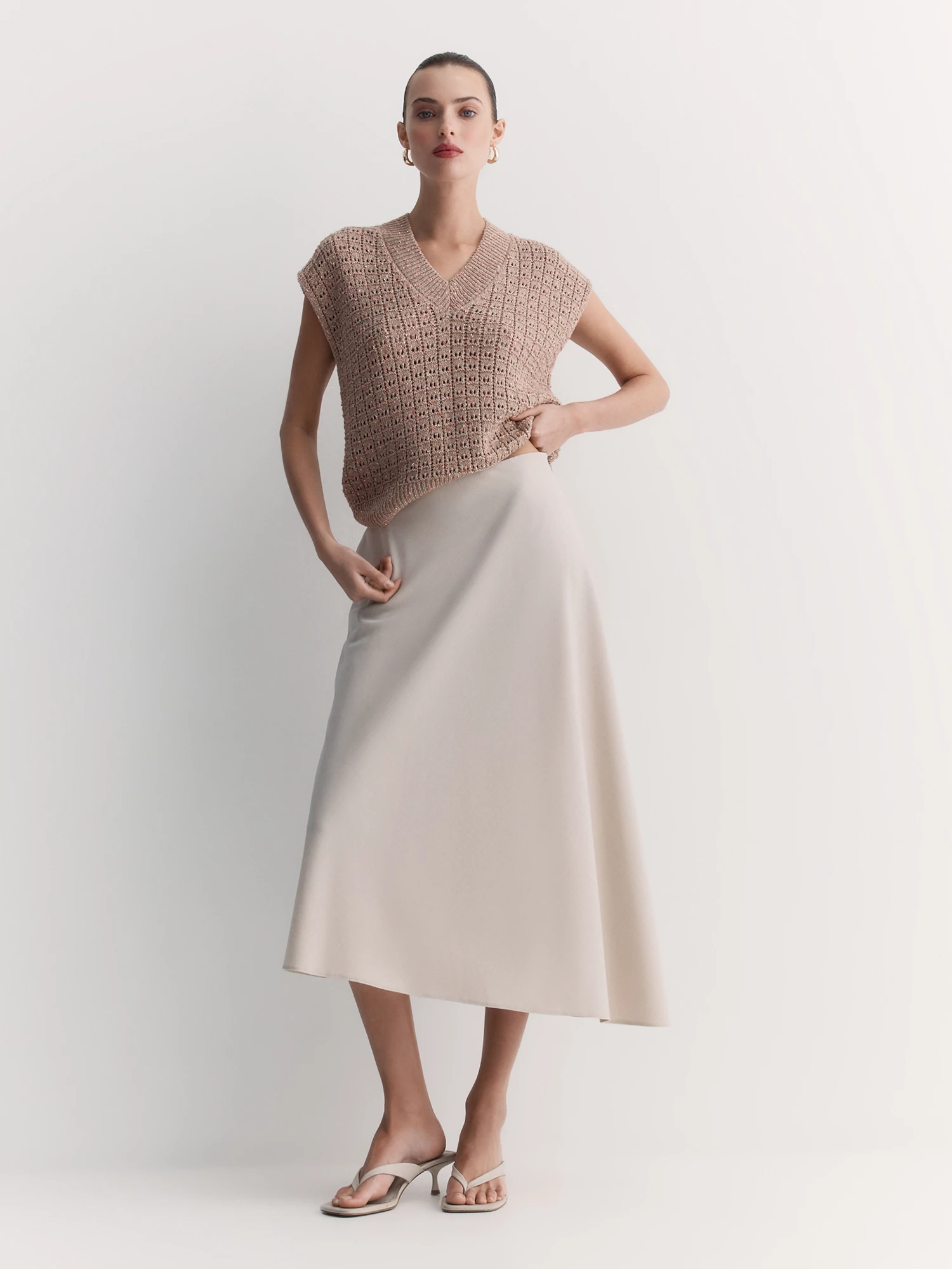 Асимметричный низ добавляет образу динамики, а надёжная фиксация на талии обеспечивает удобство в течение всего дня.