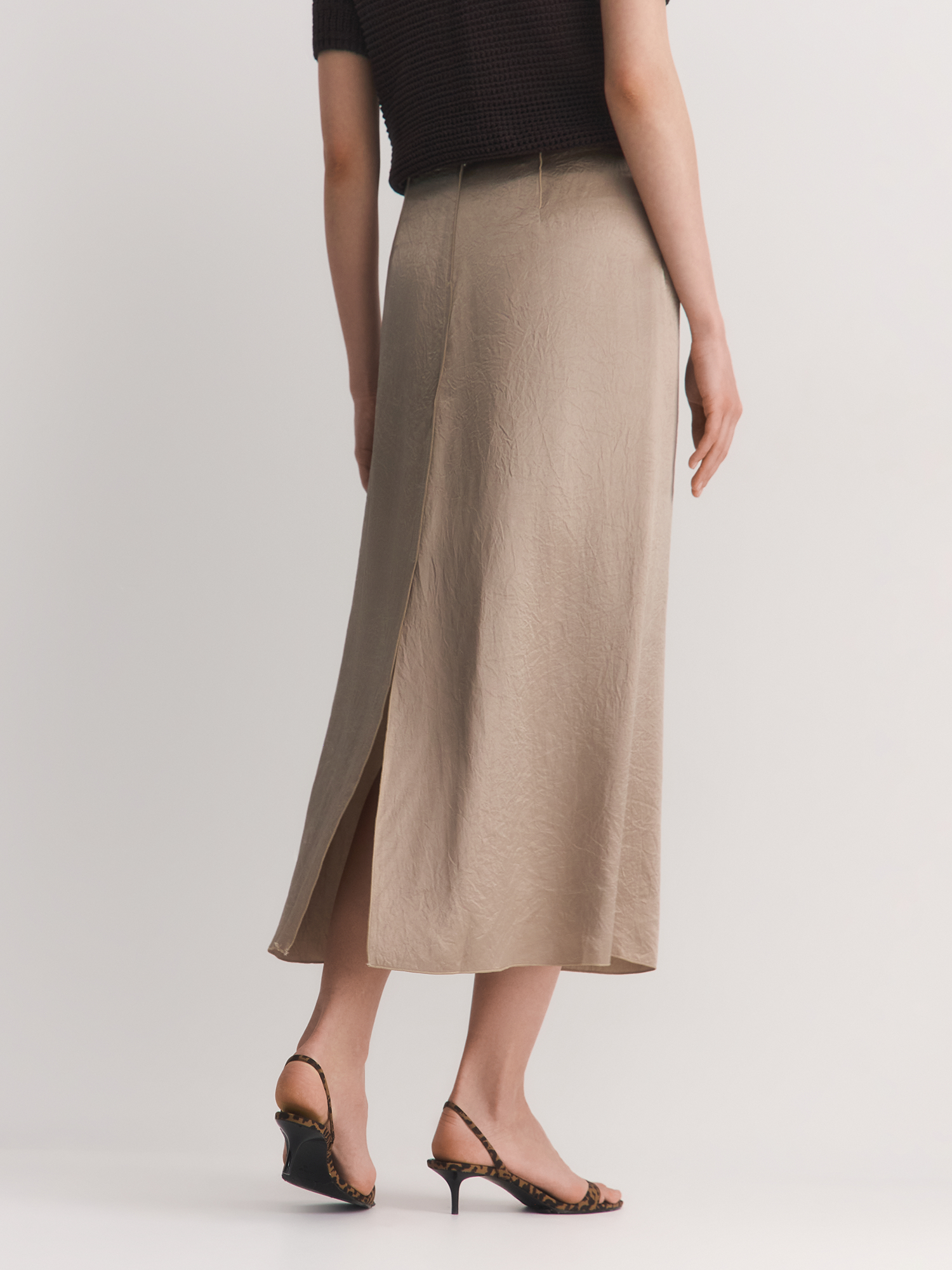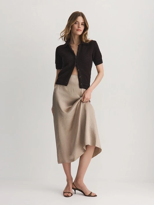 Юбка с жатым эффектом хорошо садится и эффектно драпируется. Длина миди делает модель универсальной, позволяя легко сочетать ее с различными топами, блузами и обувью, от кроссовок до элегантных туфель. Модель отличается отсутствием притачного пояса, что создает современный и минималистичный силуэт. Выполненный вместо пояса кант добавляет акцент и завершает образ, придавая ему стильный вид. Застежка на потайную молнию обеспечивает удобство и аккуратность, позволяя легко надевать и снимать изделие.