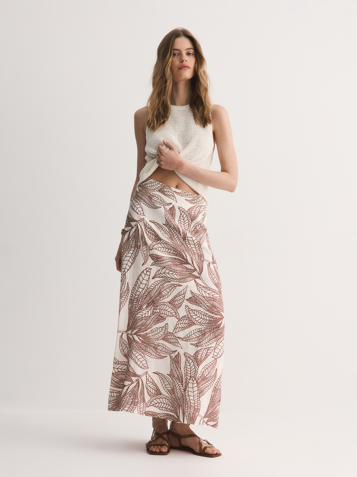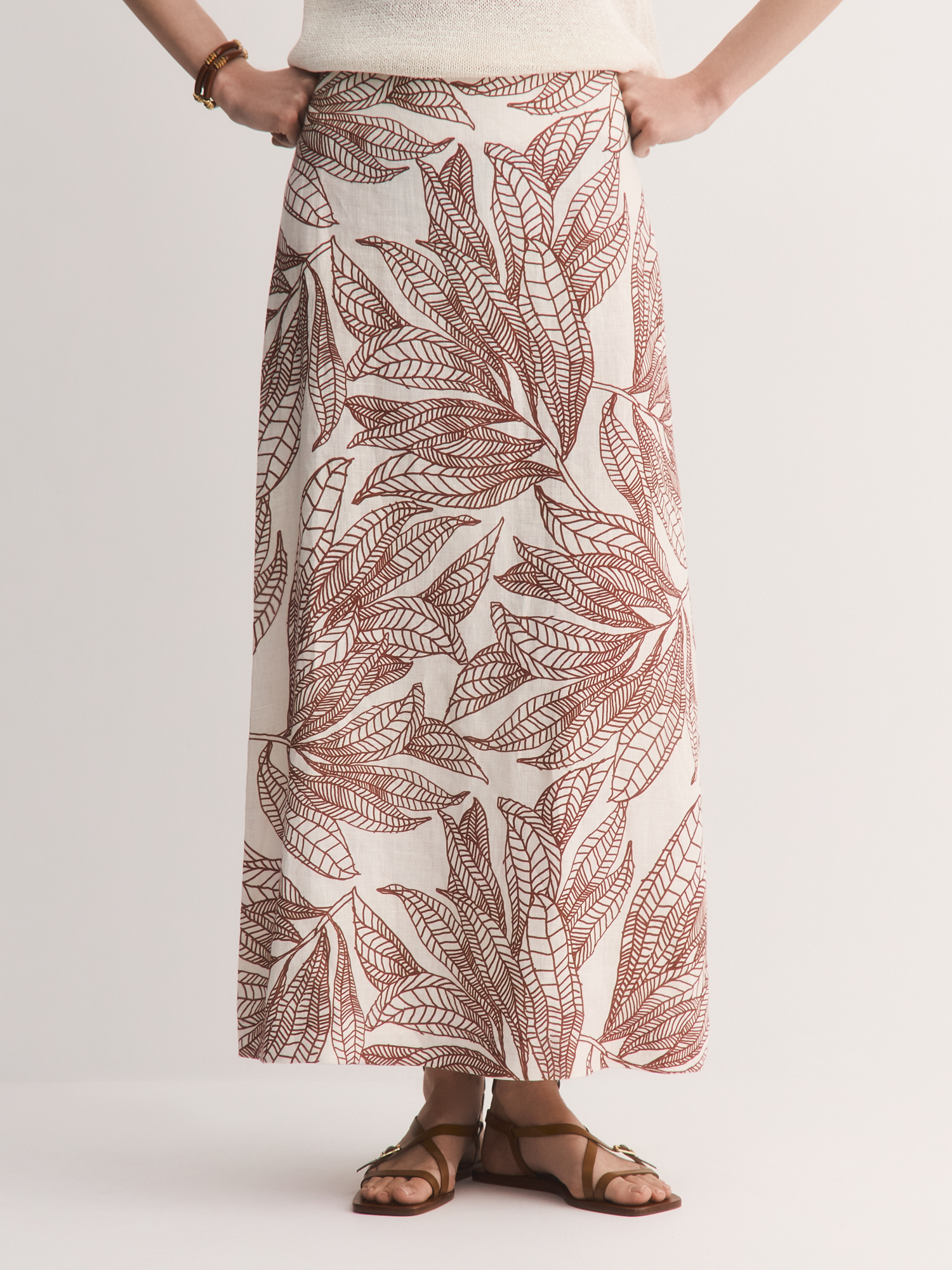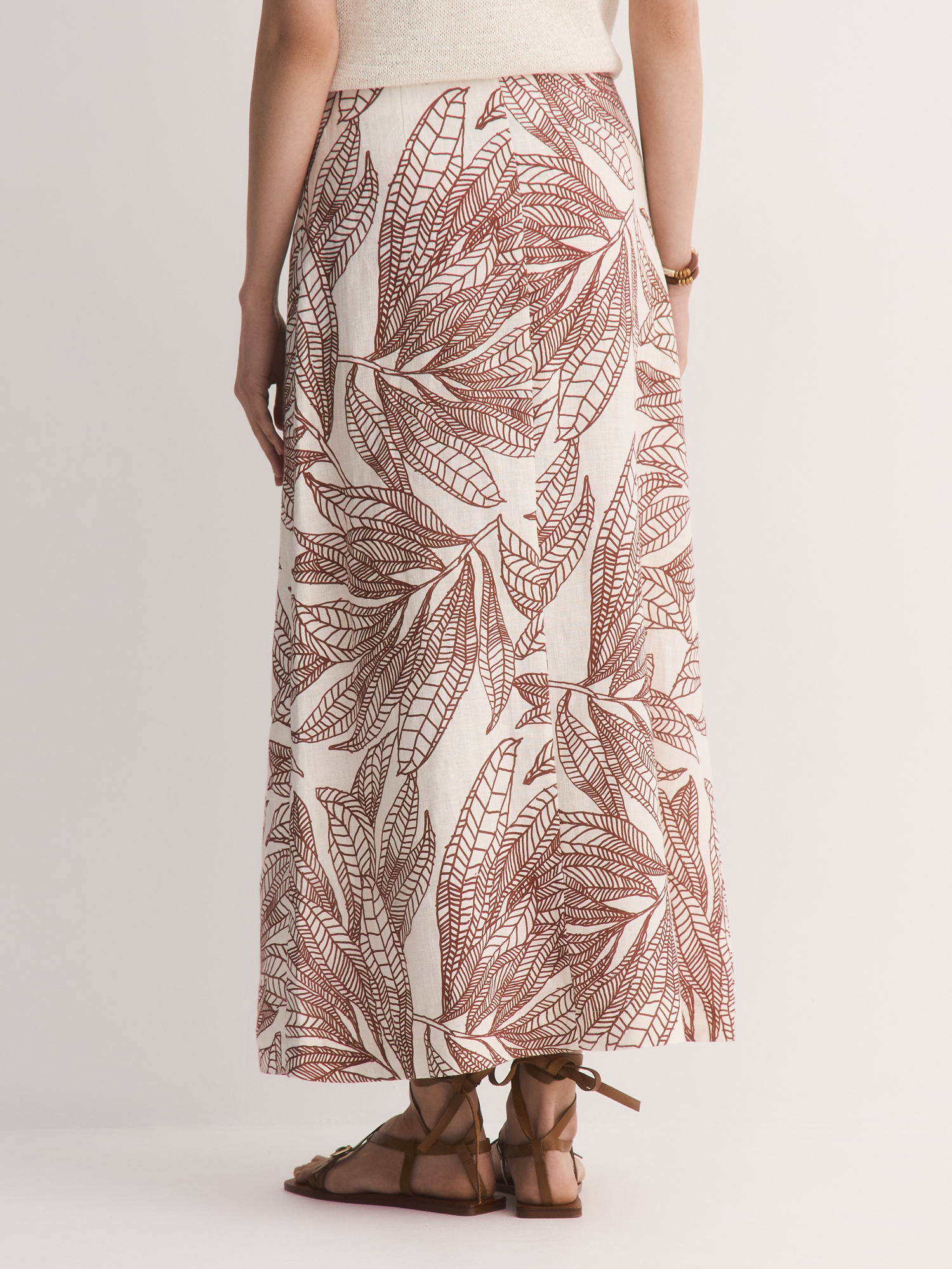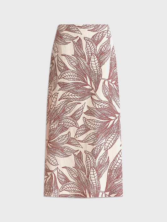 Юбка выполнена без притачного пояса для максимального комфорта, а потайная молния обеспечивает аккуратную посадку. Главное украшение – ткань с художественным терракотовым принтом на нежно-бережном фоне: графичные силуэты листьев выглядят стильно и современно.