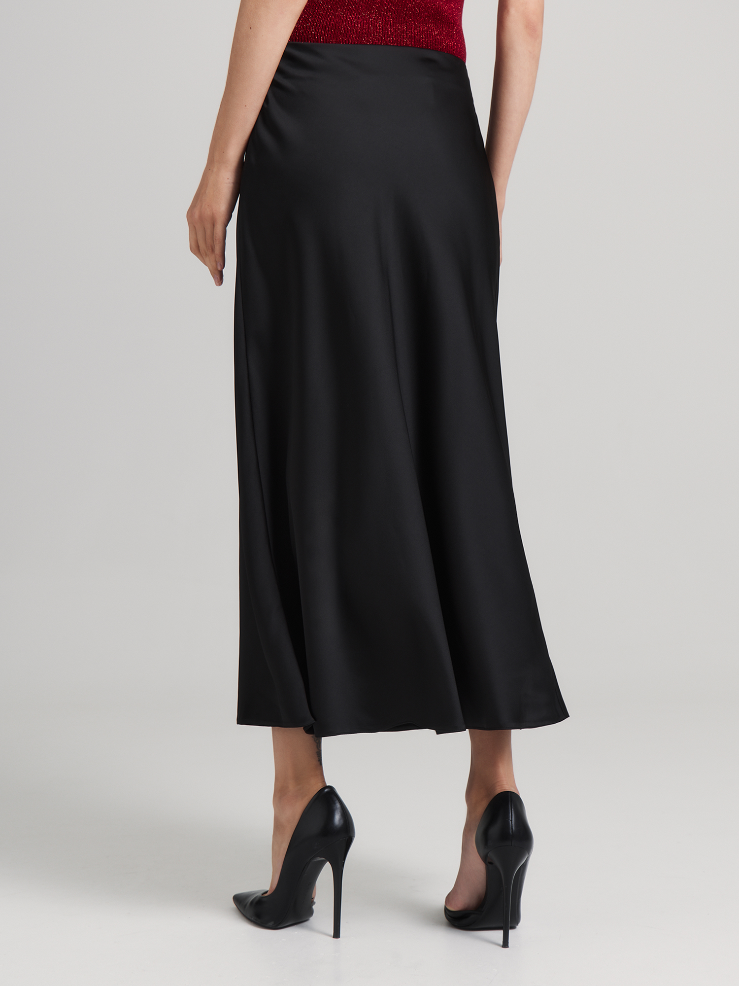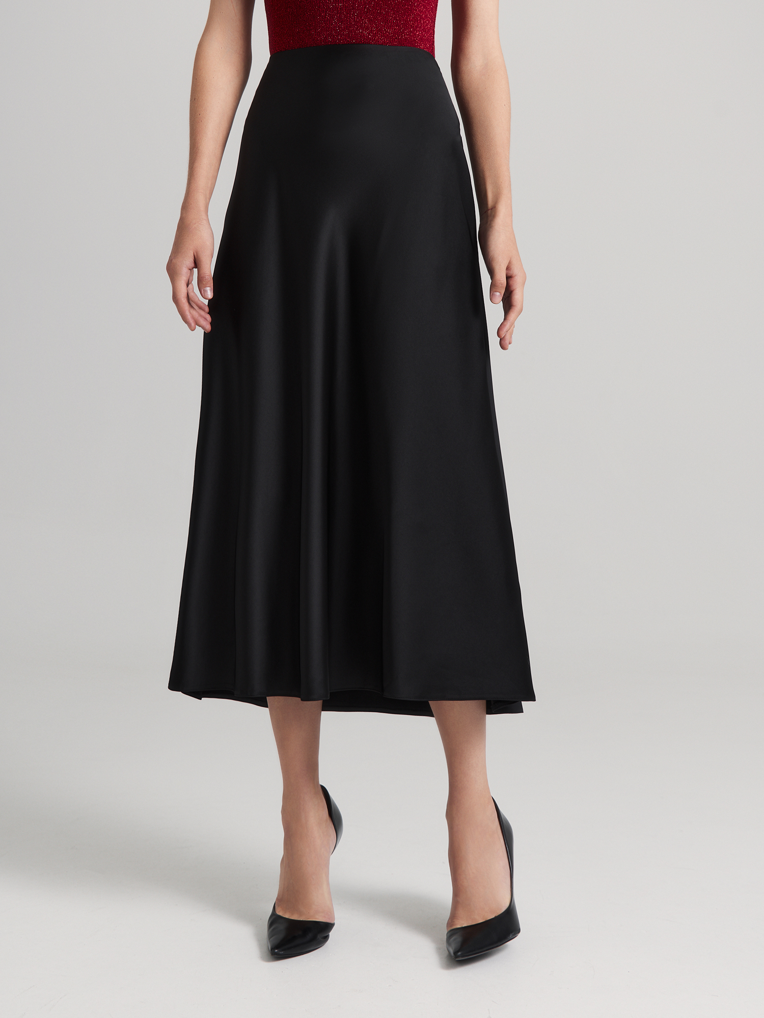 Юбка А-силуэта сшита из гладкой атласной ткани. Такое полотно хорошо держит форму, мягко переливается на свету и красиво ложится при расклешении.