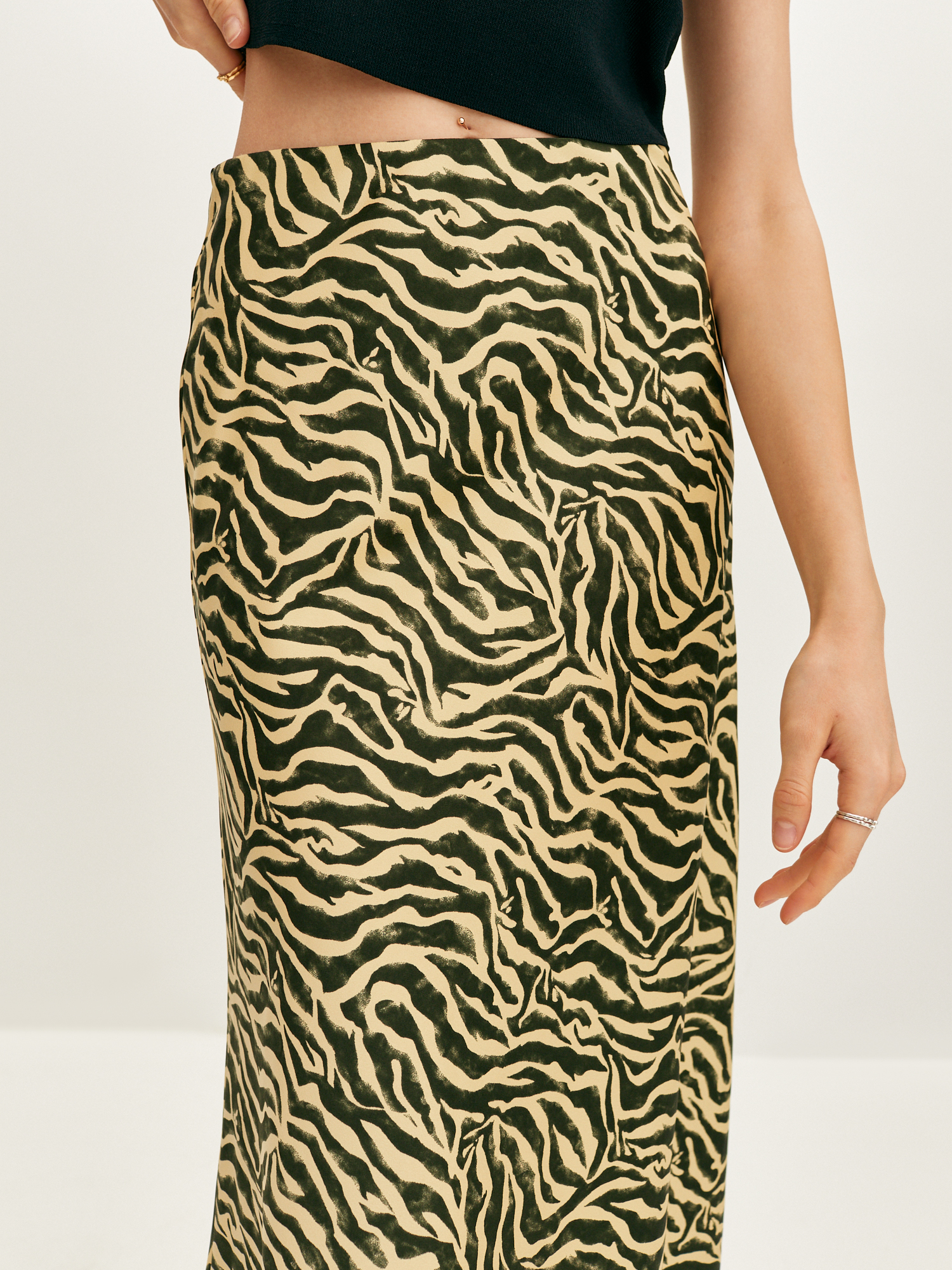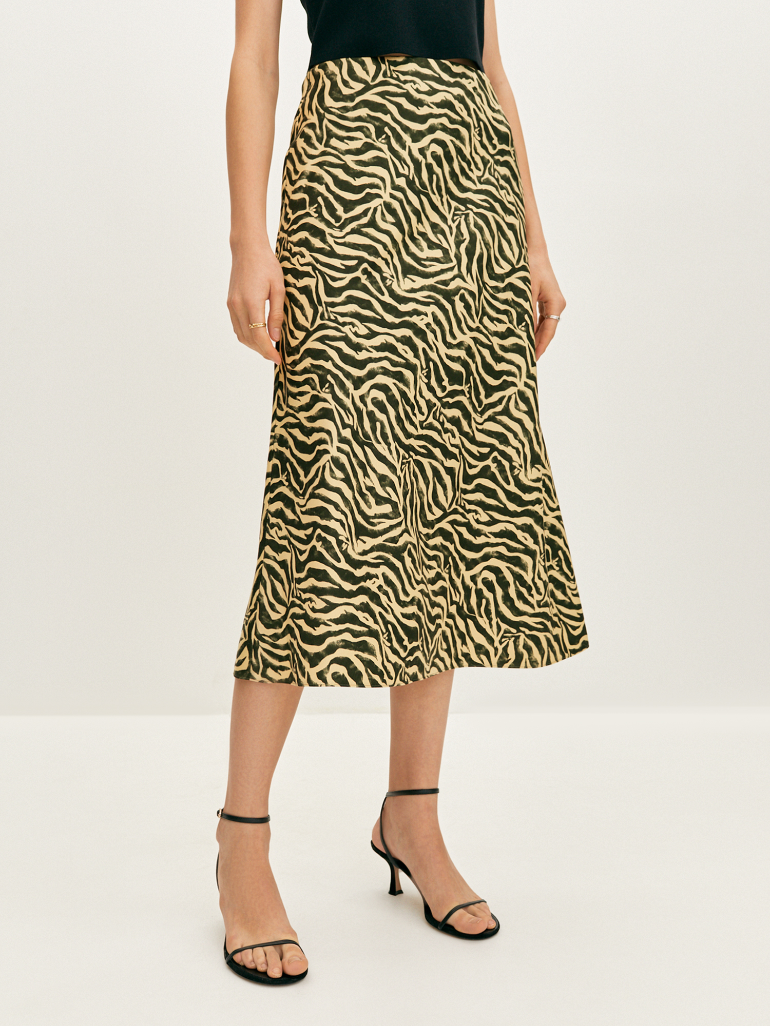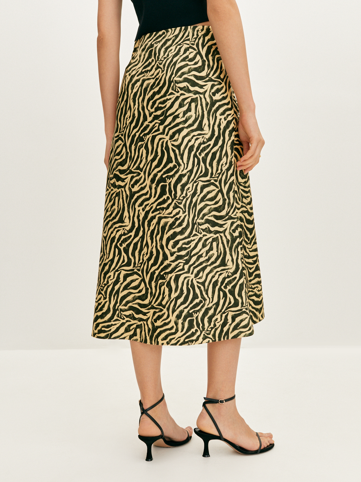 Стильная юбка-миди с ярким анималистичным принтом-зебра. Качественная легкая ткань красиво струится по фигуре и особенно приятна на ощупь. Для комфортного ношения юбка дополнена аккуратной застежкой на потайную молнию. Высокая посадка отлично садится по фигуре, а мягкое расклешение к низу особенно эффектно смотрится в движении. Юбка разбавит повседневные луки и станет свежим дополнением гардероба.