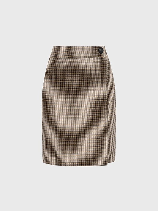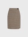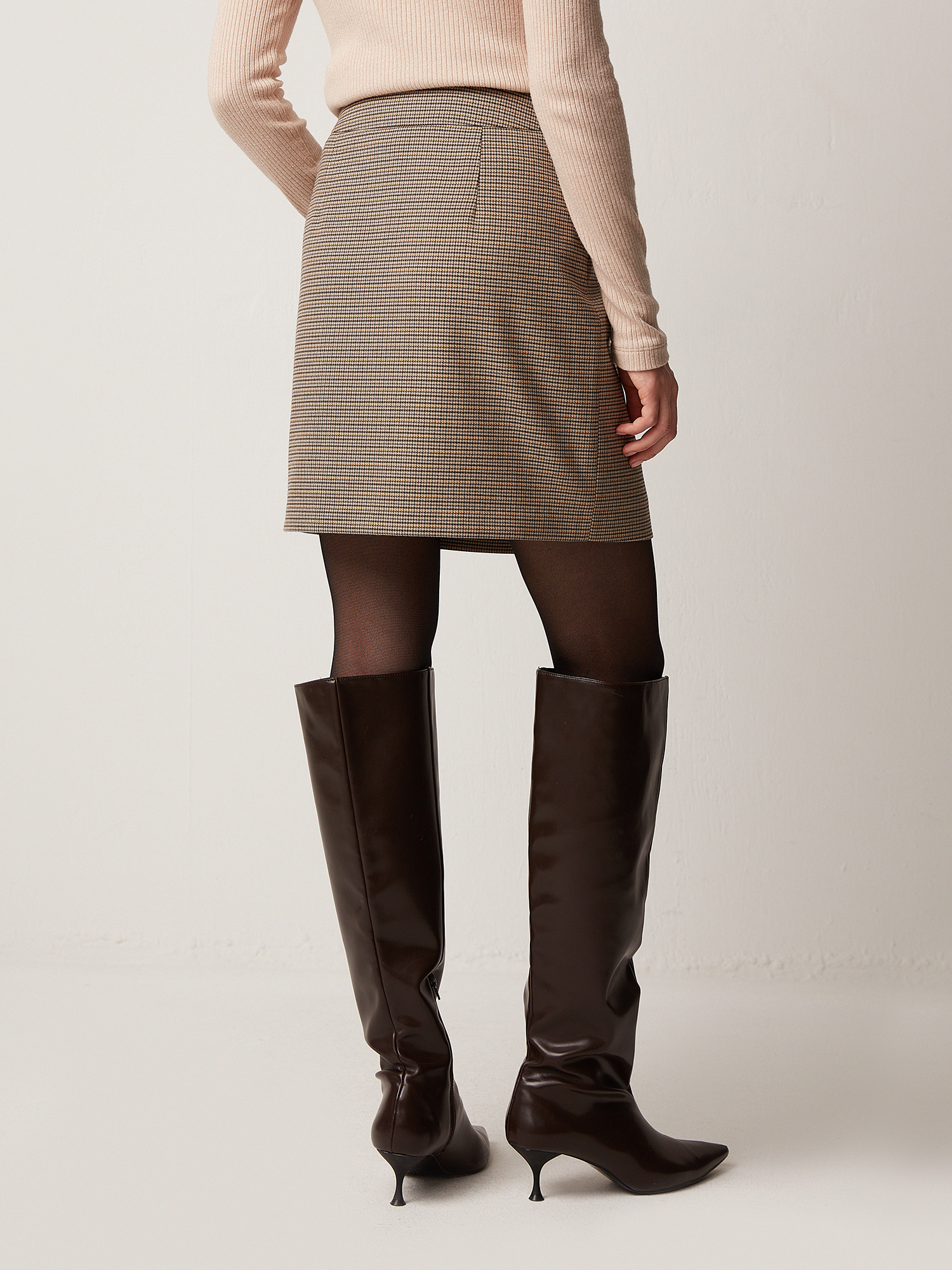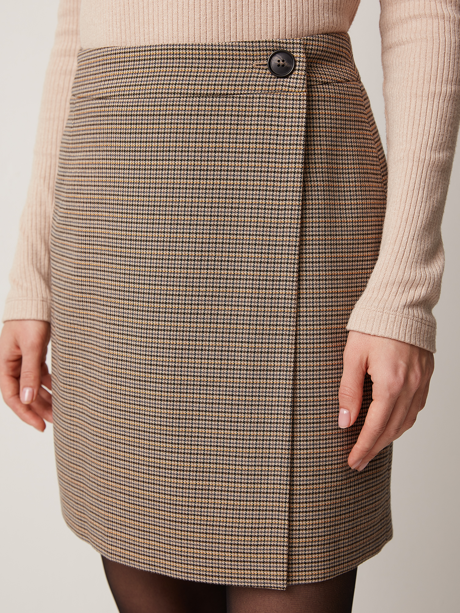Юбка-мини на запах с авторским принтом пье-де-пуль в серо-бежевой гамме. Плотная поливискоза хорошо держит форму и почти не мнётся. Модель прямого силуэта, с притачным поясом и застёжкой на контрастную пуговицу. Талиевые вытачки обеспечивают комфортную посадку по фигуре. Образ можно дополнить трикотажным лонгсливом или вязаным джемпером.