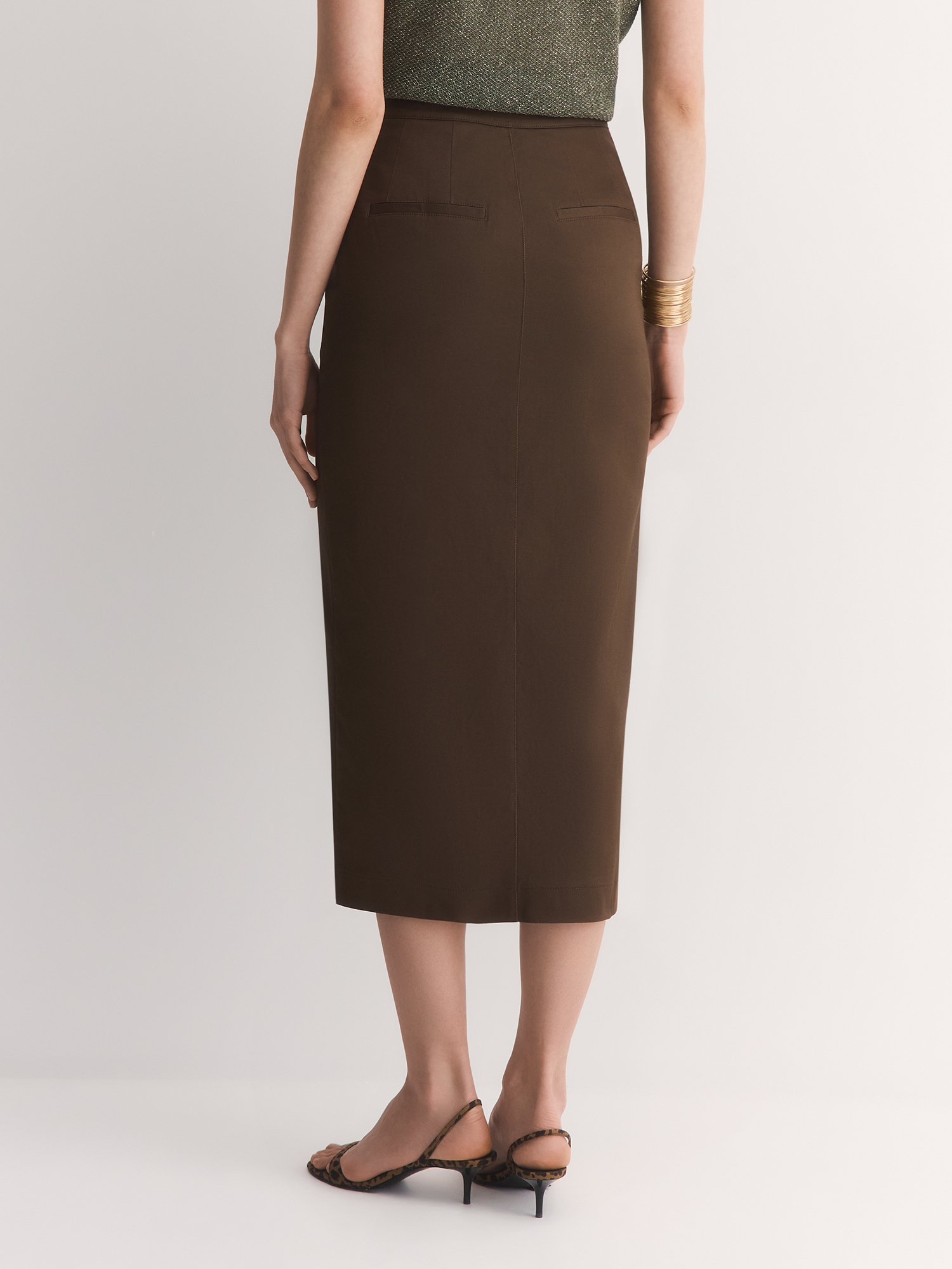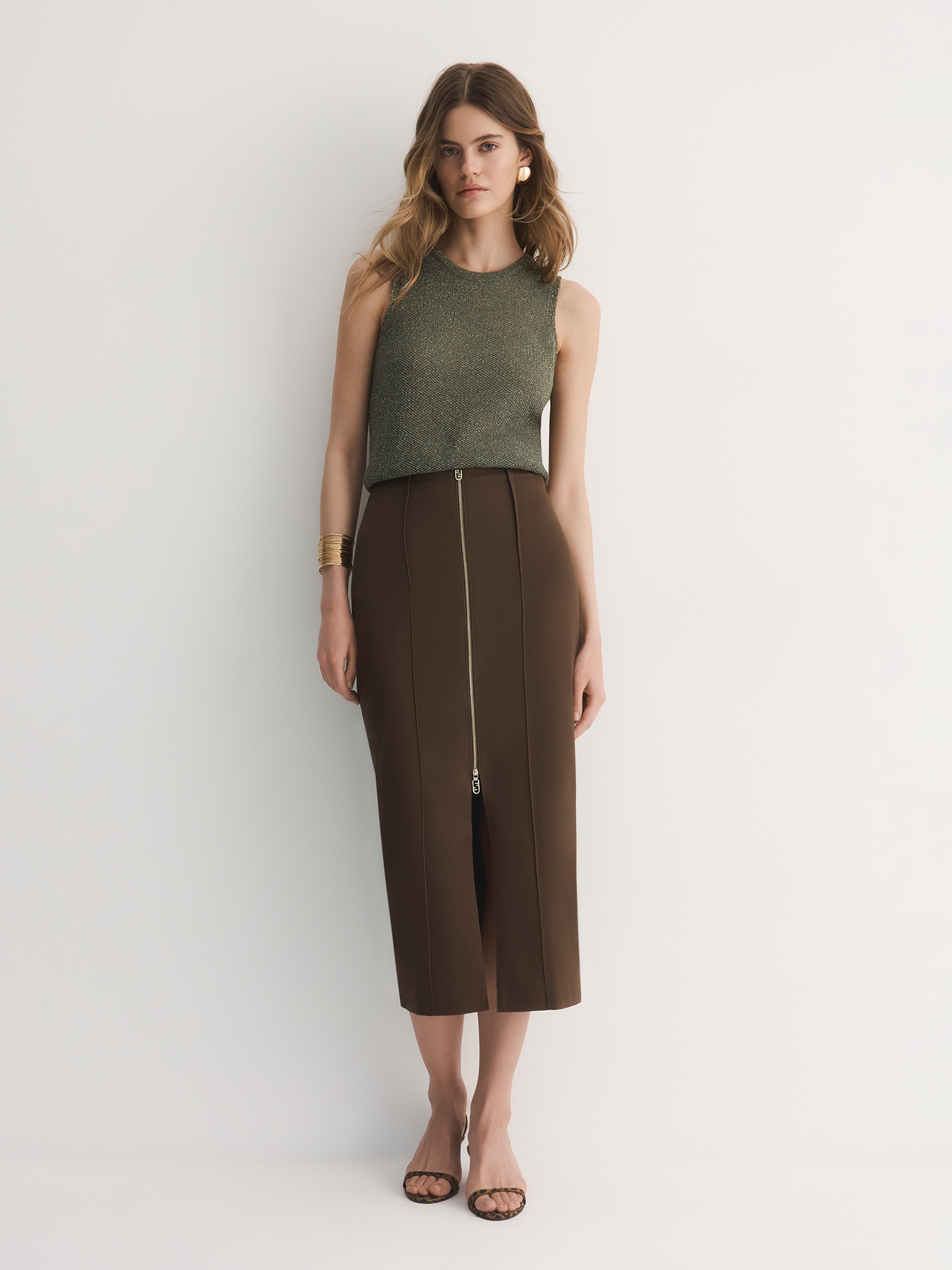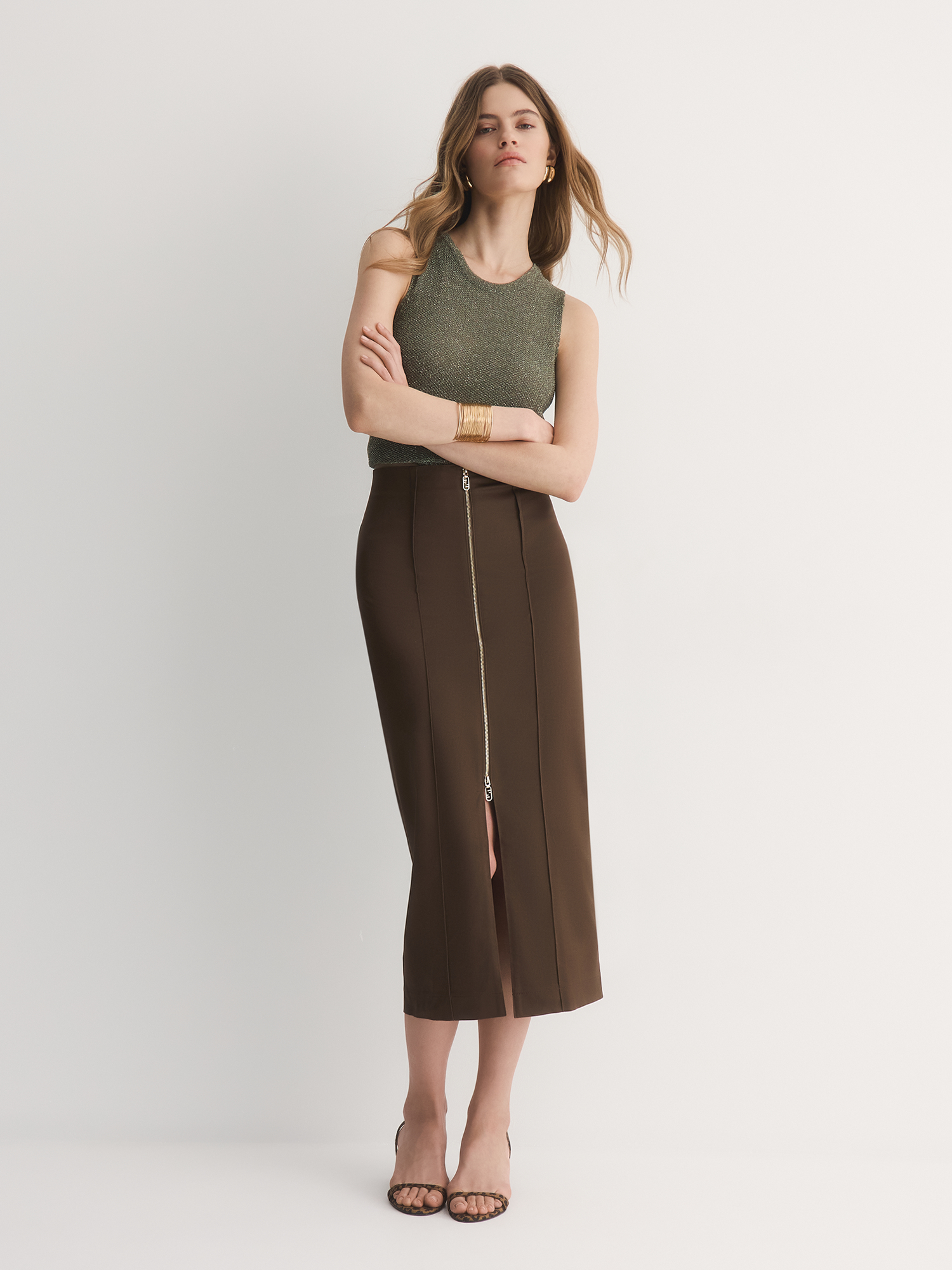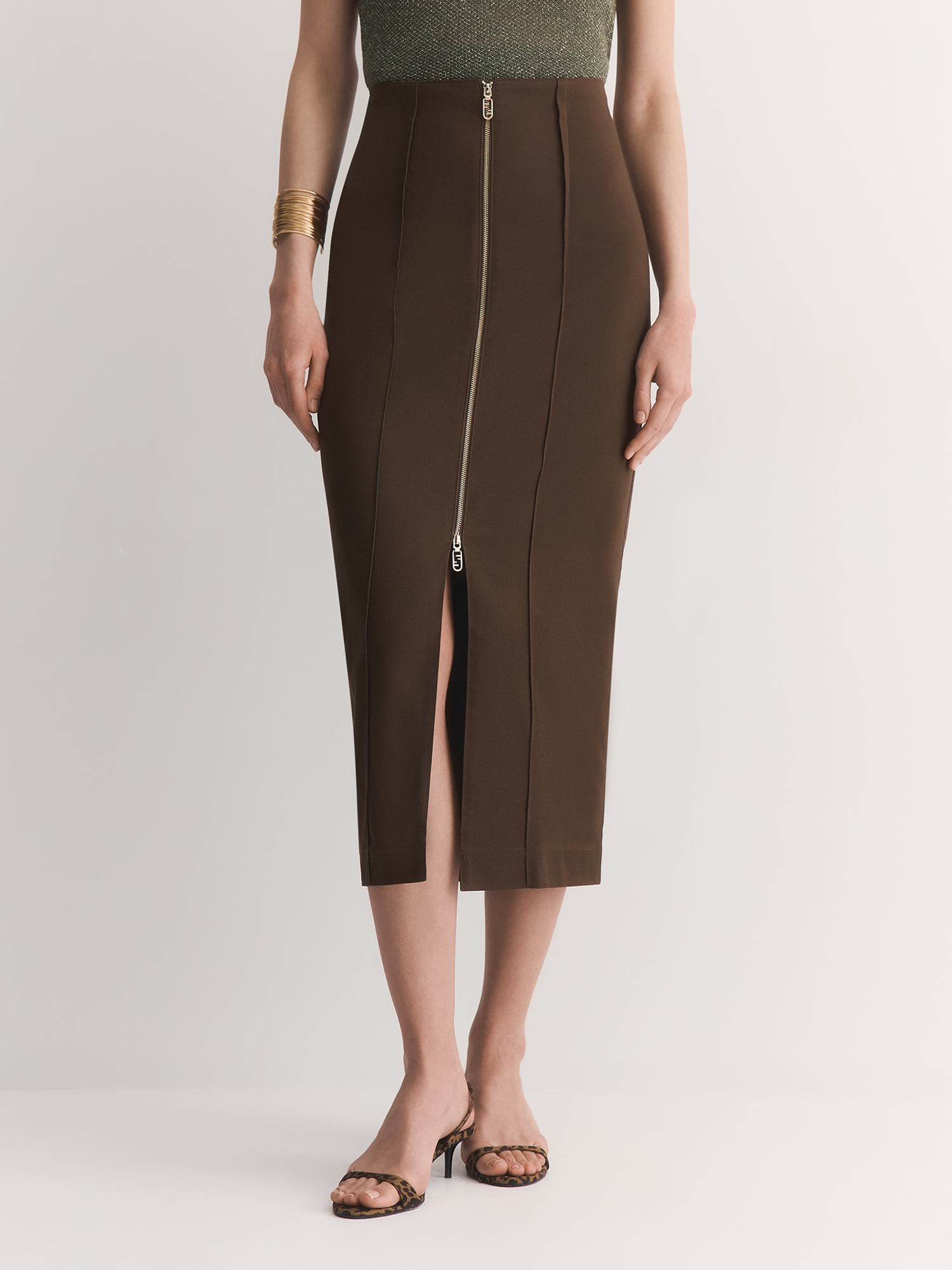 Юбка-карандаш с высокой посадкой, декоративными вертикальными швами и акцентной застежкой на золотистую молнию — является продуктом смешения гламурного и классического стилей.