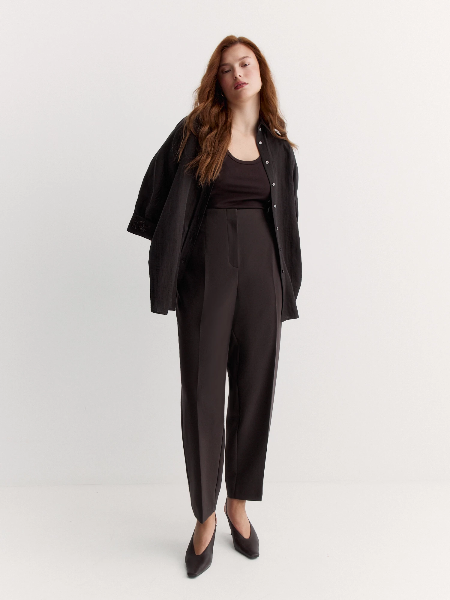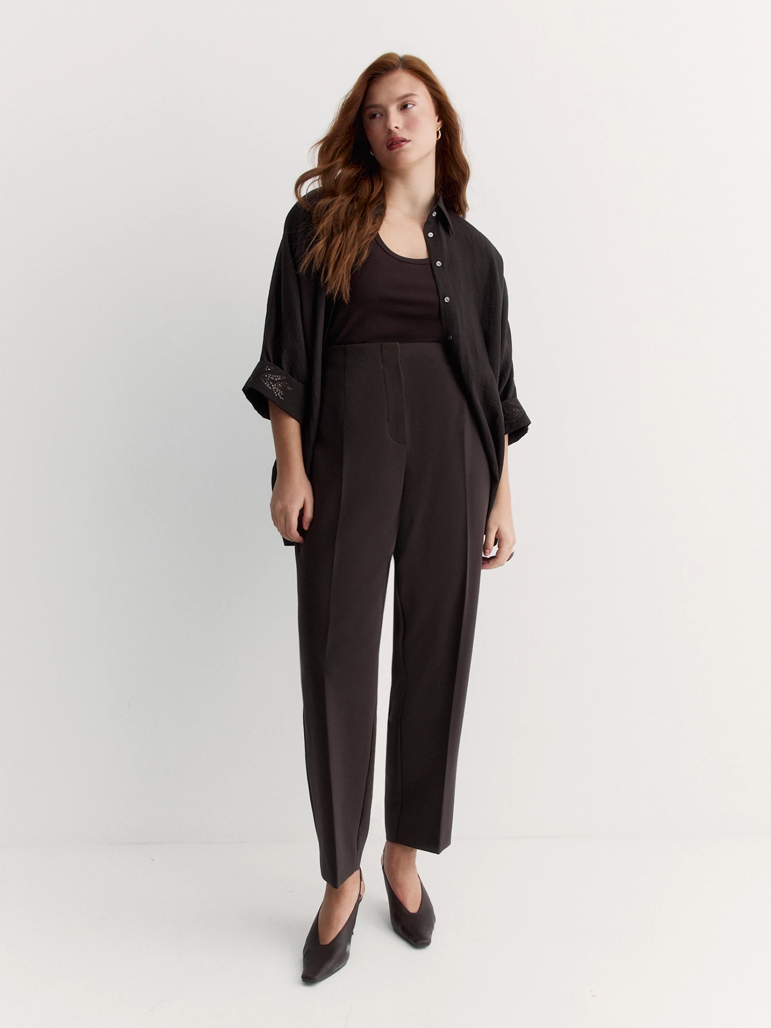 Модель без притачного пояса с вытачками обеспечивает аккуратный силуэт, а отсутствие карманов сохраняет чистые линии. Зауженный крой и укороченная длина делают брюки современными и универсальными.