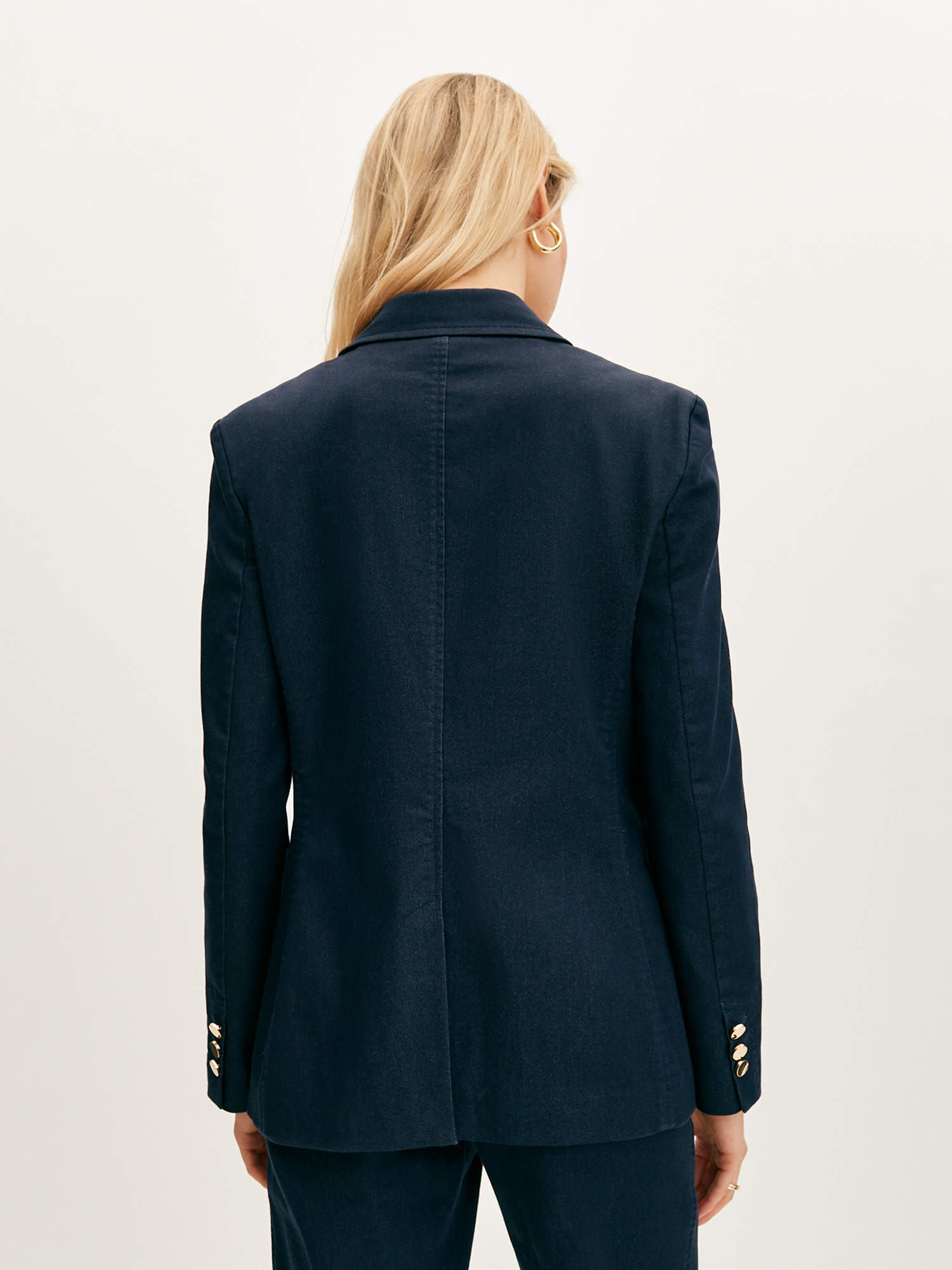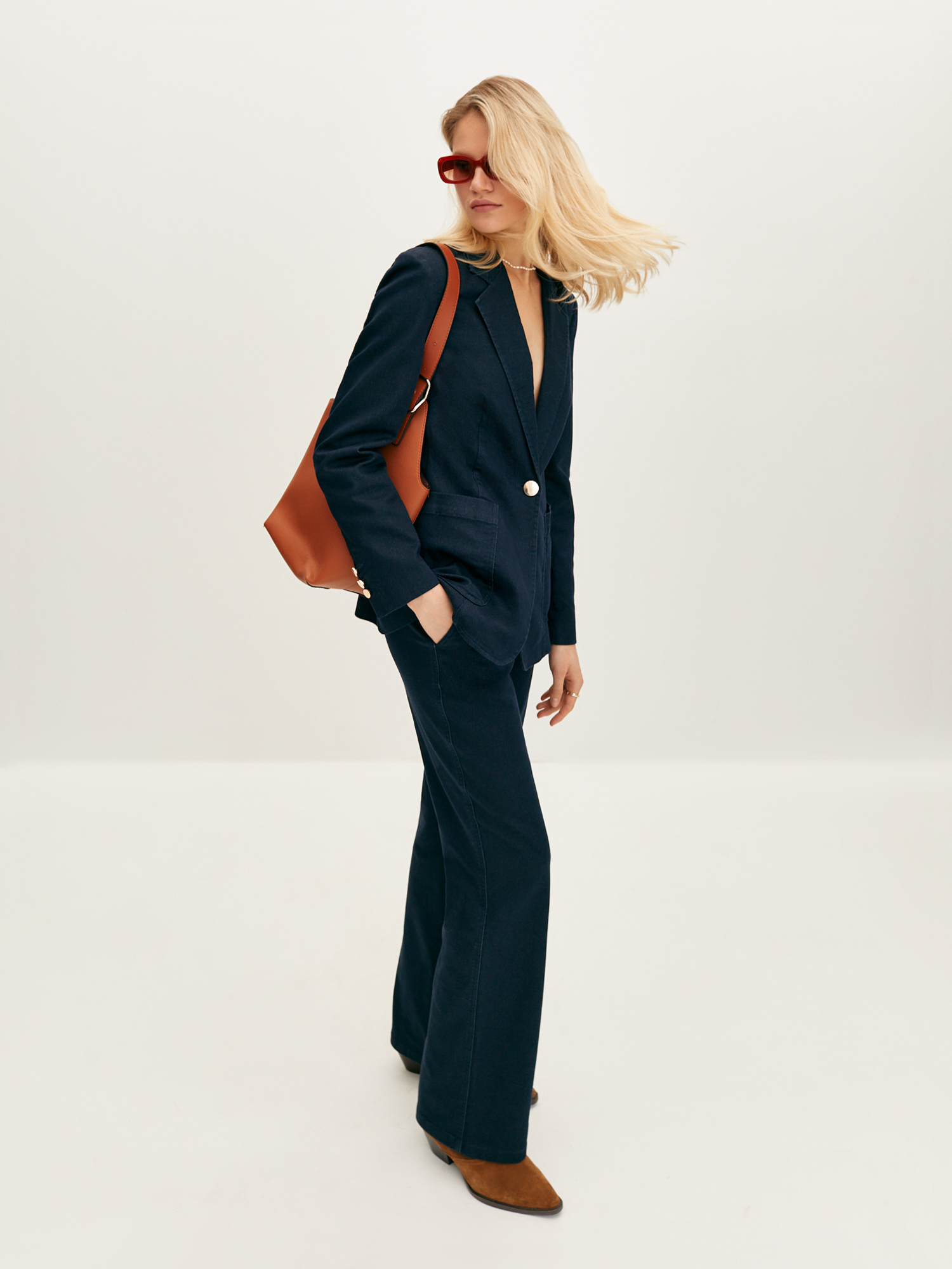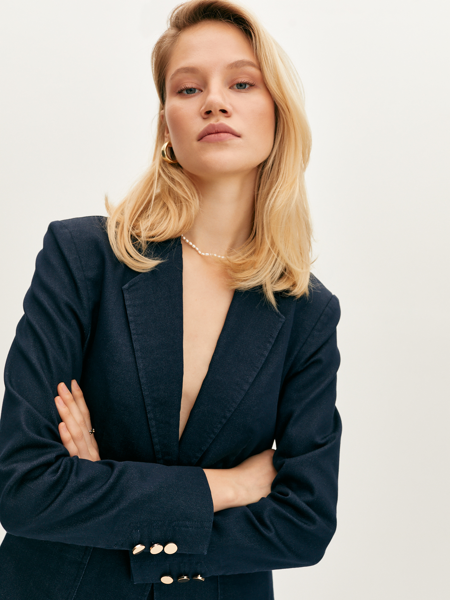 Жакет в стиле смарт-кэжуал с рельефами сдержанного тёмно-синего цвета. Модель прямого силуэта, с отложным воротником с лацканом, длинным втачным рукавом, крупными накладными карманами и однобортной застёжкой на пуговицу. Пару жакету составят джинсы-клёш из того же материала.