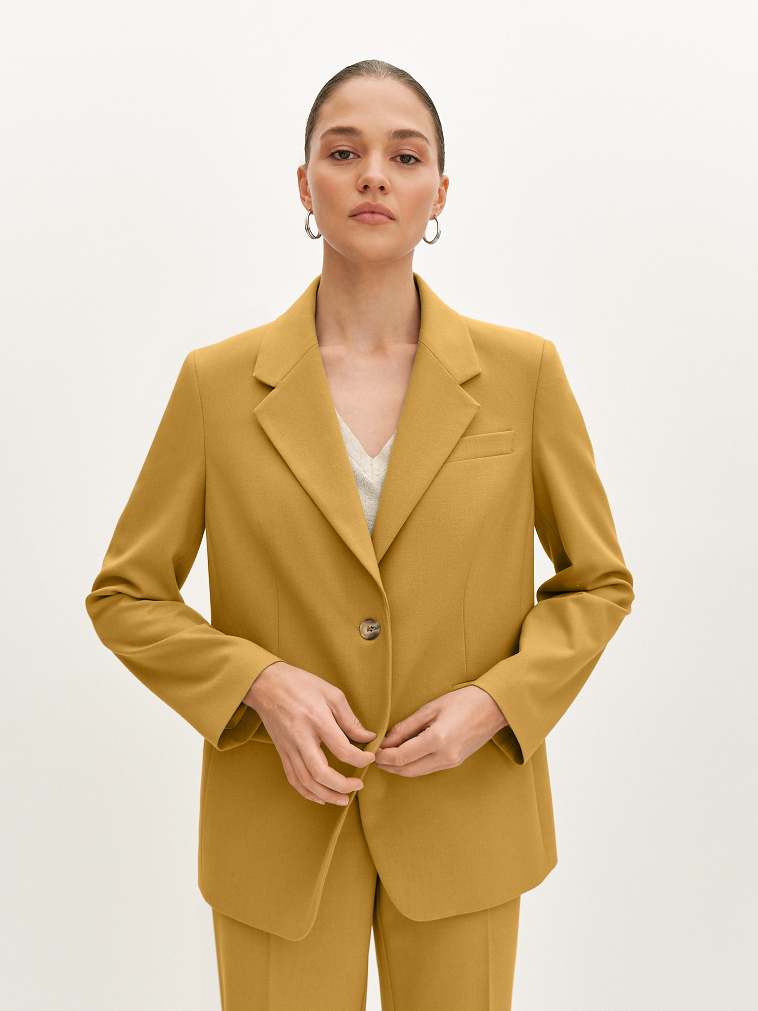 Однобортный жакет в ярком горчичном оттенке выполнен из эластичной смесовой ткани на основе вискозы. Легкий, мягкий материал отлично пропускает воздух, слегка тянется и достаточно прост в уходе. Полуприлегающий силуэт отлично садится по фигуре, не сковывает движения и, при этом, не теряет форму. Модель с отложным воротником, длинным втачным рукавом и центральной застежкой на пуговицы. С пиджаком из этой коллекции создадут классический деловой образ.