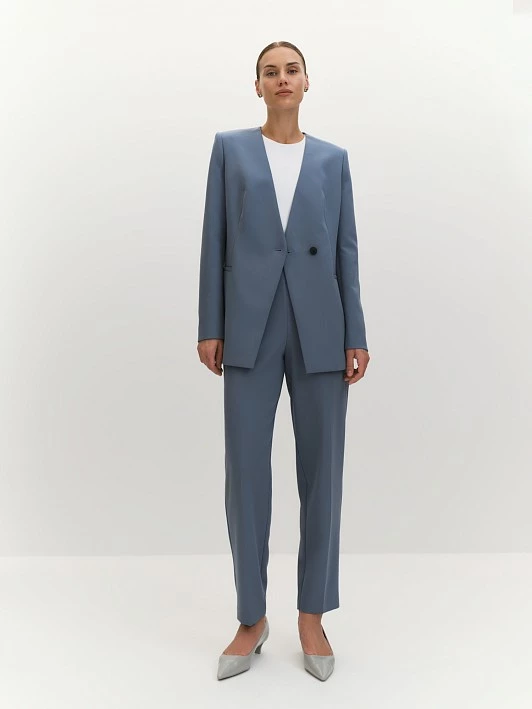 Цвет жакета с говорящим названием «весеннее озеро» идеально подходит для костюма с четким и выверенным кроем. Темно-голубой оттенок символизирует совершенство и осознанность, что делает его универсальным выбором для различных мероприятий — от деловых встреч до вечерних выходов.