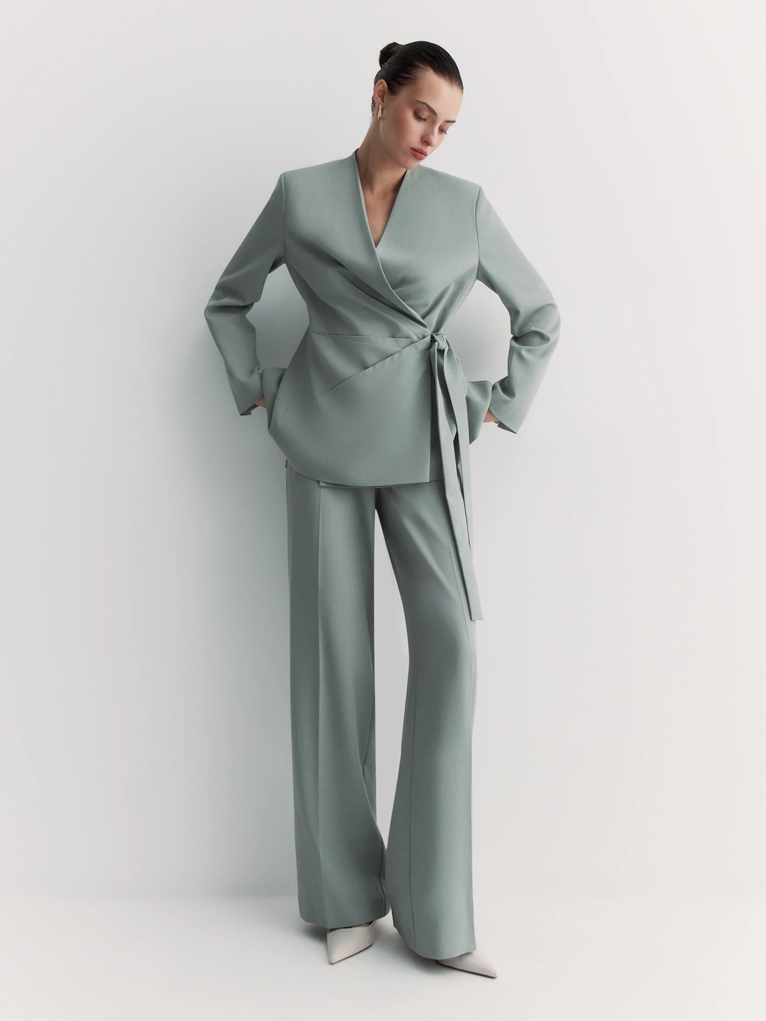 Асимметричный запах со складками, расходящимися лучами от пояса, добавляет образу динамики. Удобные шлицы сзади и на рукавах обеспечивают свободу движений. Полная подкладка в нежном серо-зеленом оттенке шалфея делает жакет комфортным в носке.