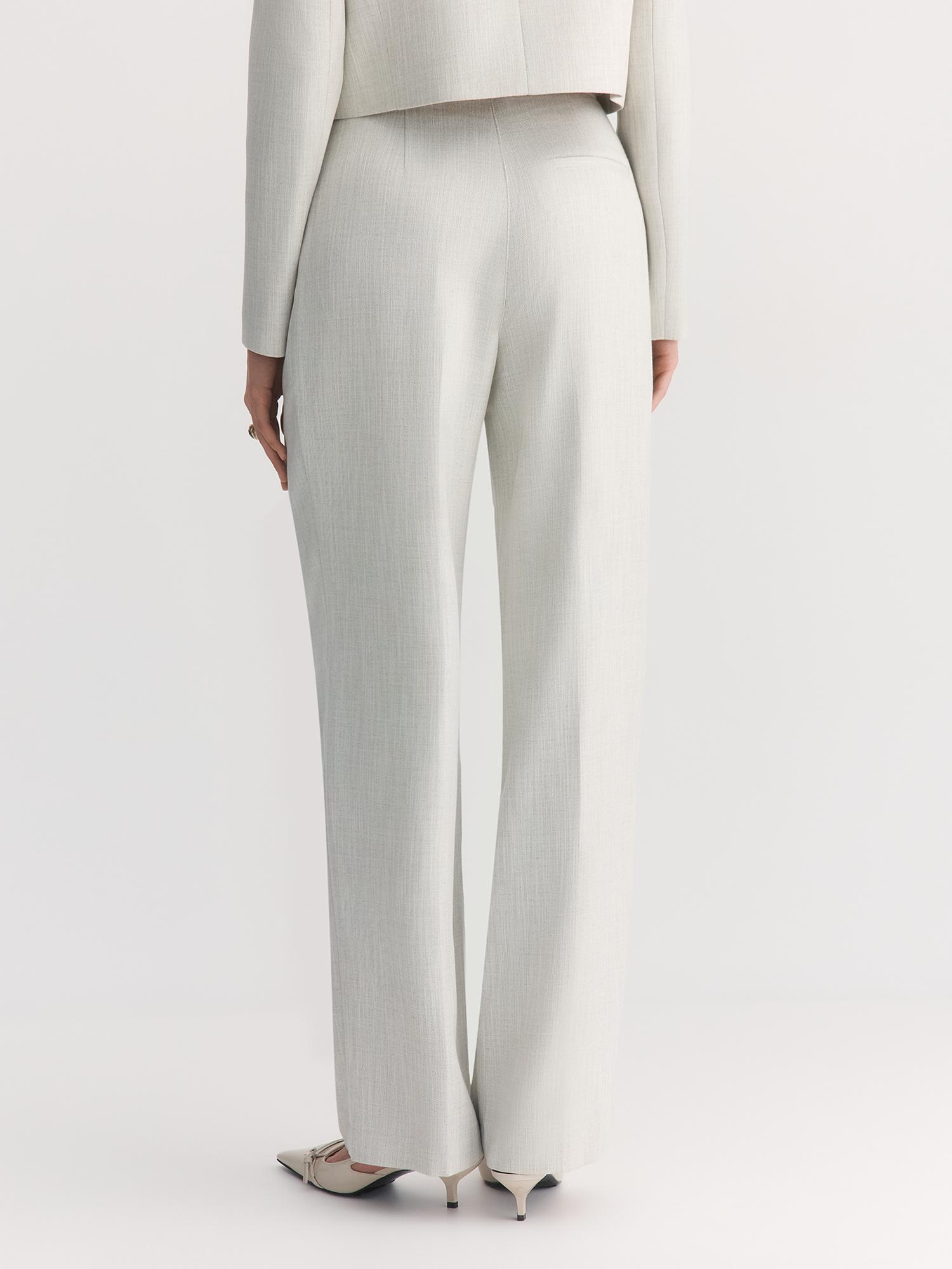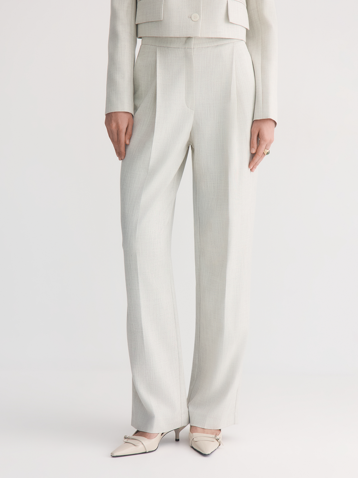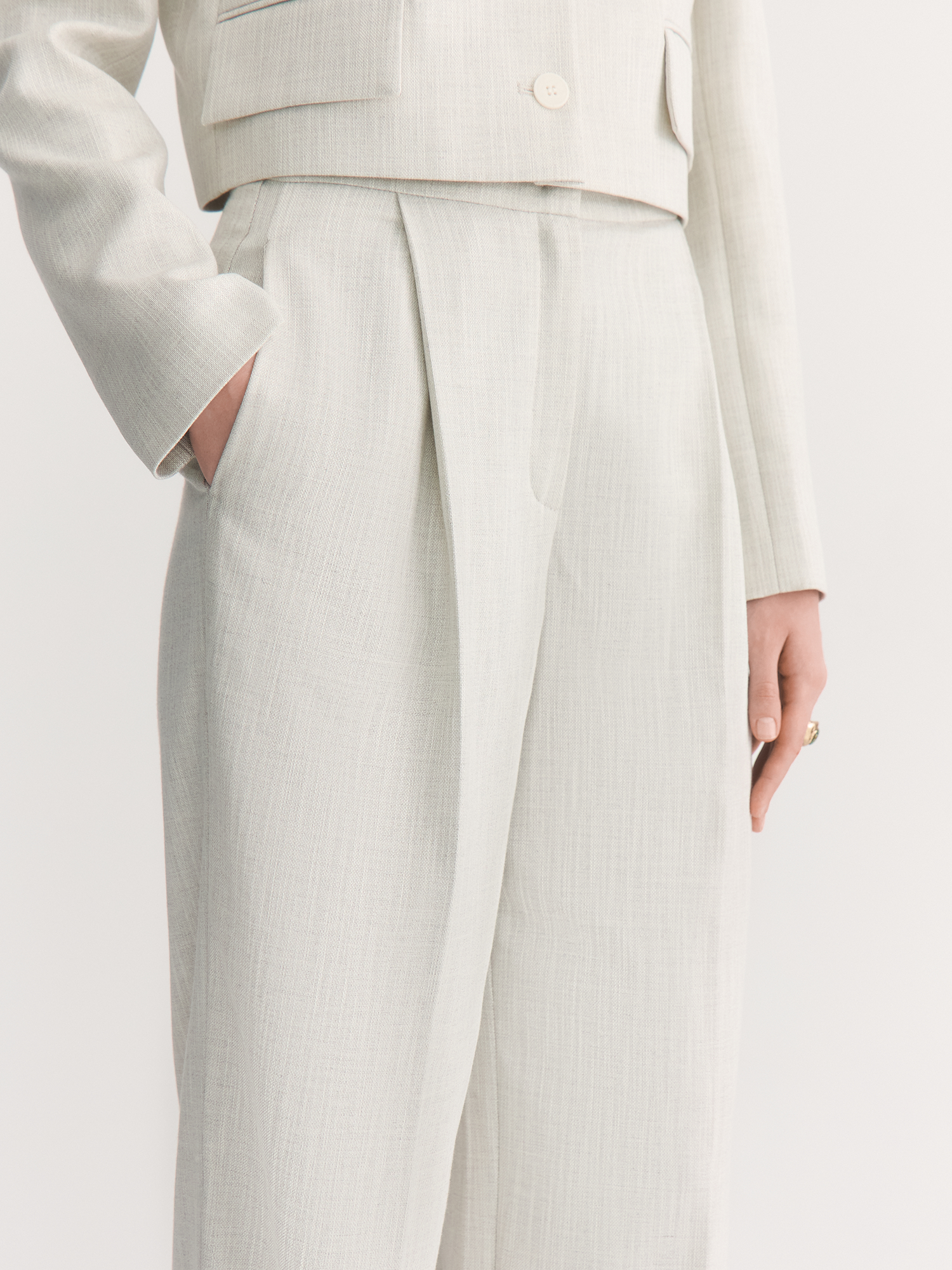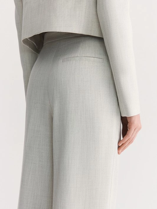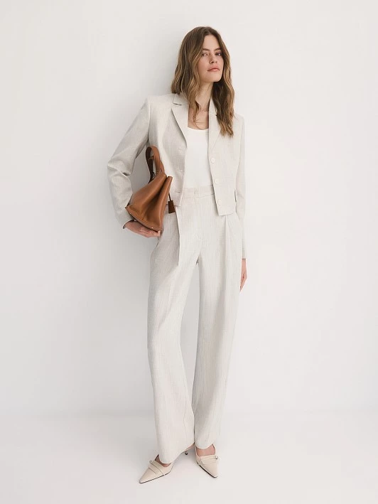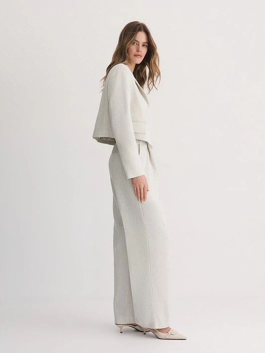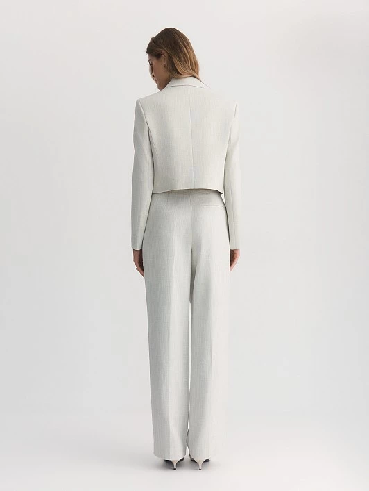 Выбранная ткань обладает отличными эксплуатационными характеристиками. Поливискоза прочная и долговечная, а также обладает хорошей воздухопроницаемостью. Люрекс придает полотну легкий деликатный блеск, что добавляет изысканности. Нежный оттенок «Гардения» прекрасно раскрывается в костюмной ткани на основе вискозы, создавая романтичный и стильный образ. Светло-серый меланжевый цвет жакета универсален и легко комбинируется с различными элементами гардероба.