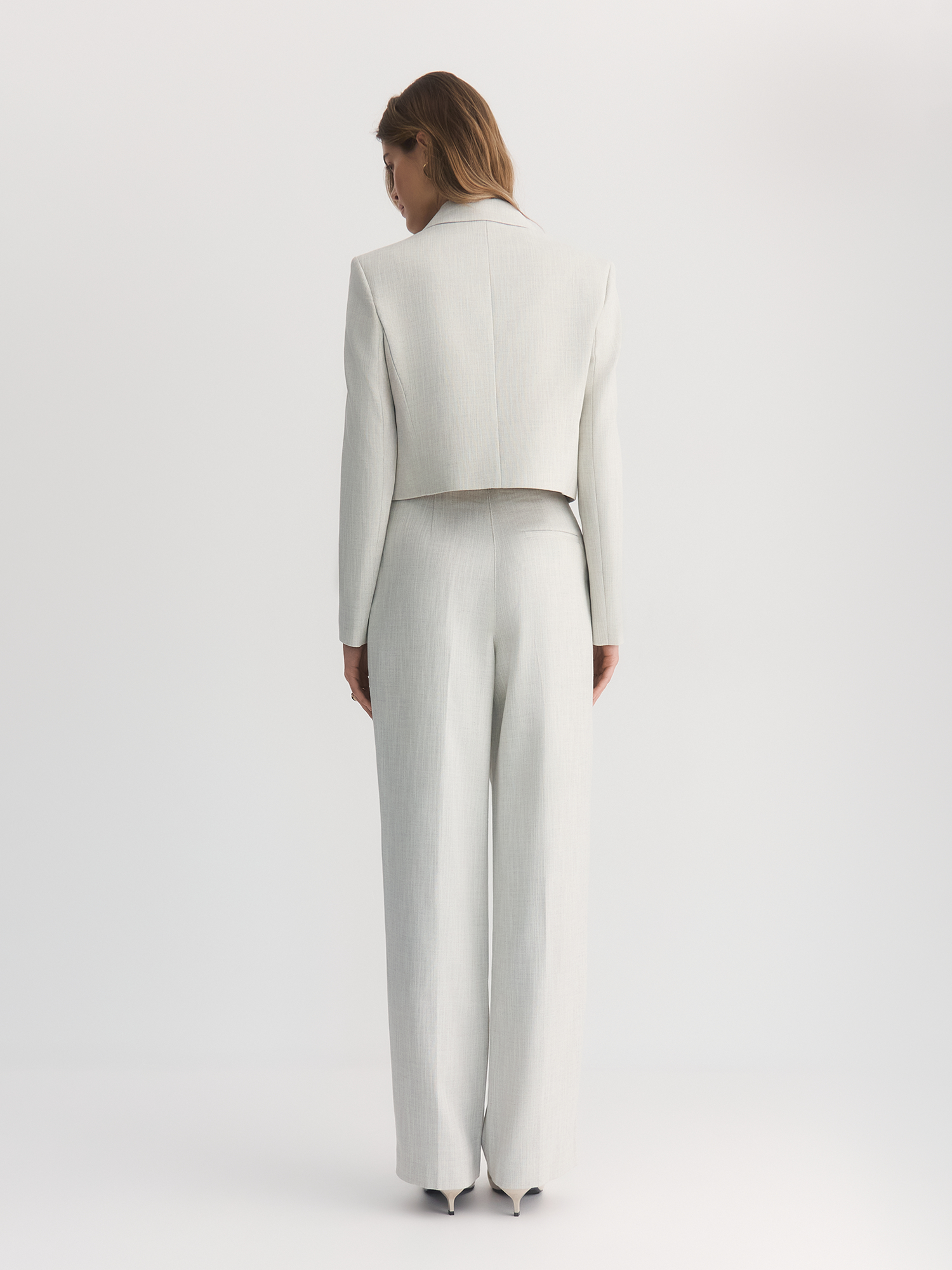 Выбрали для укороченного жакета однобортный крой и классический английский воротник. Прорезные карманы с акцентными клапанами добавляют функциональности и стиля. Вертикальные рельефы и вытачки обеспечивают правильную посадку, подчеркивая силуэт. Небольшой акцент на плечи визуально помогает сделать талию тоньше.