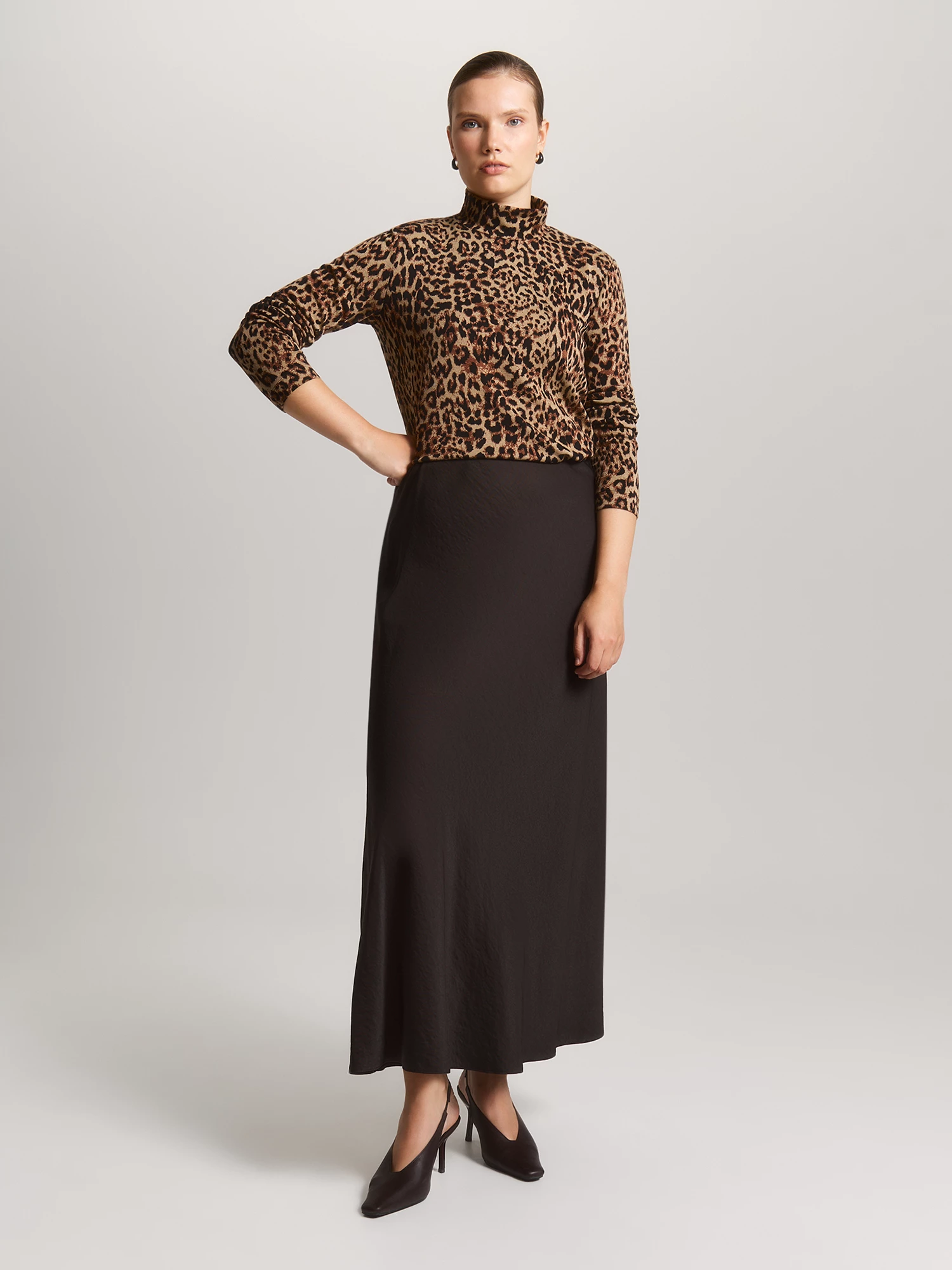 Джемпер комфортного облегания с горлом, средним по высоте воротником-стойкой и втачным длинным рукавом. Выбрали для базового гольфа смесовый трикотаж, он характеризуется гигроскопичностью (хорошо впитывает воду) и высокими показателями воздухопроницаемости – за это спасибо вискозе. Полиэстер же отвечает за продление срока службы и возможность долго носить модель из такой ткани под верхнюю одежду. Водолазка с анималистичным принтом больших размеров будет востребована как офисная, школьная, повседневная.