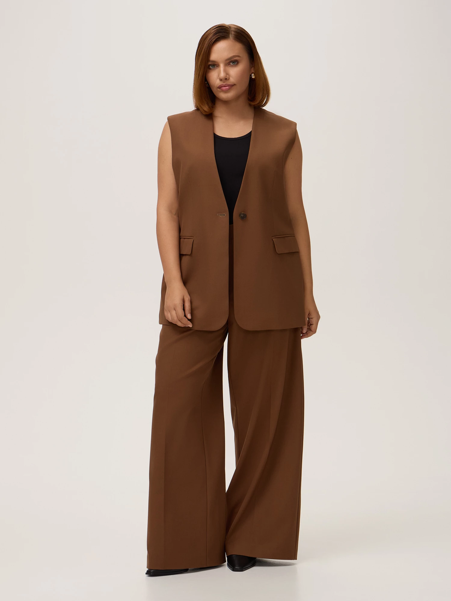 Удлиненный костюмный жилет выполнен с акцентом на современный дизайн и комфорт, что делает его идеальным для создания как деловых, так и повседневных образов. Жилет не имеет воротника, что придаёт ему минималистичный и утончённый вид. Застежка на пуговицы обеспечивает надежную фиксацию и позволяет легко регулировать посадку. Вертикальные рельефы, расположенные на спине, способствуют правильному прилеганию по фигуре, подчеркивая силуэт и создавая эффектный образ. Боковые карманы с клапанами добавляют функциональности и стиля, позволяя удобно хранить мелкие вещи. Это делает жилет не только красивым, но и практичным элементом гардероба. Модель выполнена из качественной костюмной ткани, в состав которой входят вискоза, поливолокна и эластан. Вискоза придаёт ткани мягкость и дышащие свойства, что обеспечивает комфорт в носке на протяжении всего дня. Поливолокна добавляют прочности и долговечности, а эластан обеспечивает эластичность, позволяя жилету сохранять свою форму. Данный жилет можно легко сочетать с различными элементами гардероба — от классических блузок до стильных топов, создавая гармоничные и модные образы.