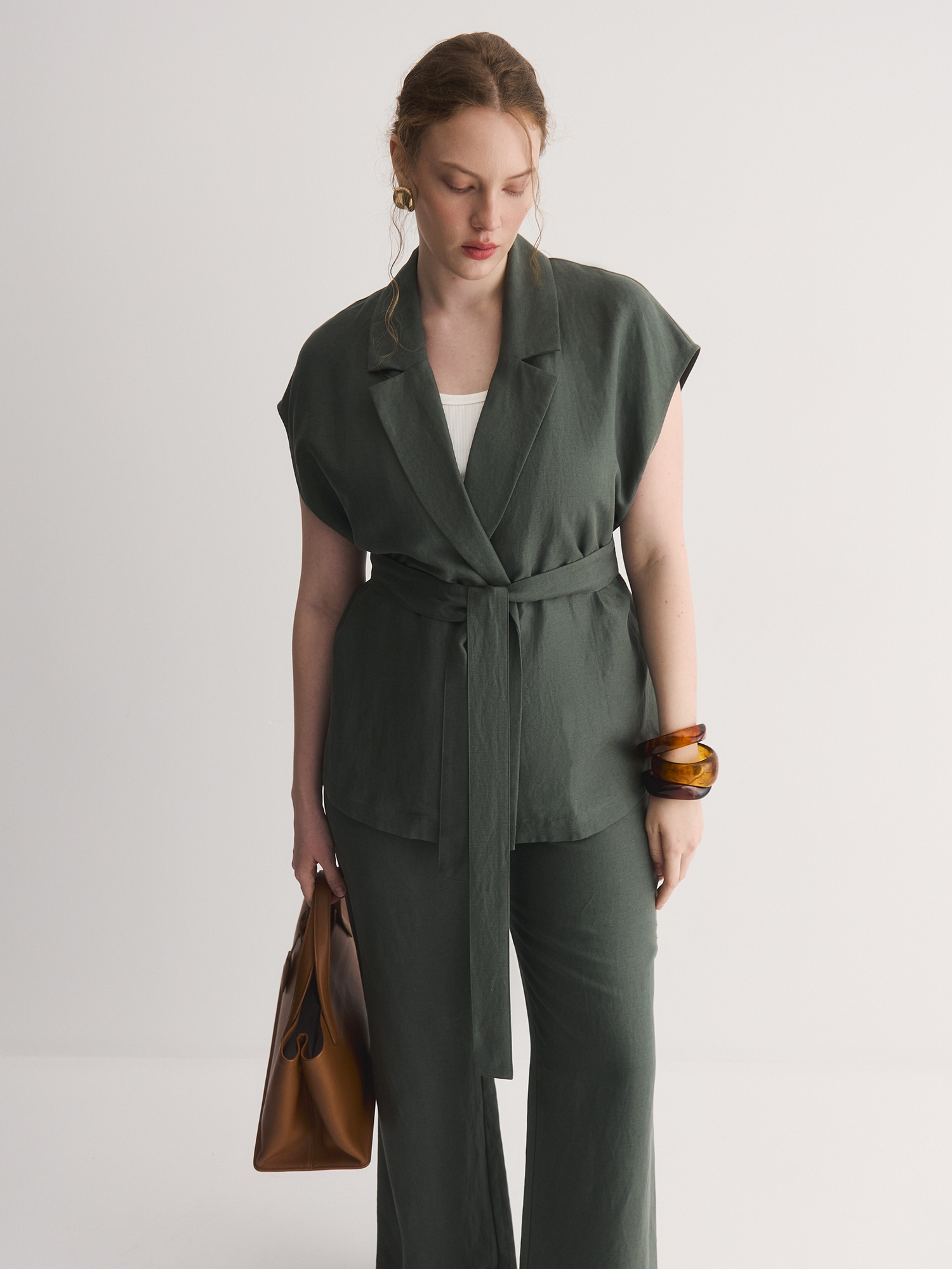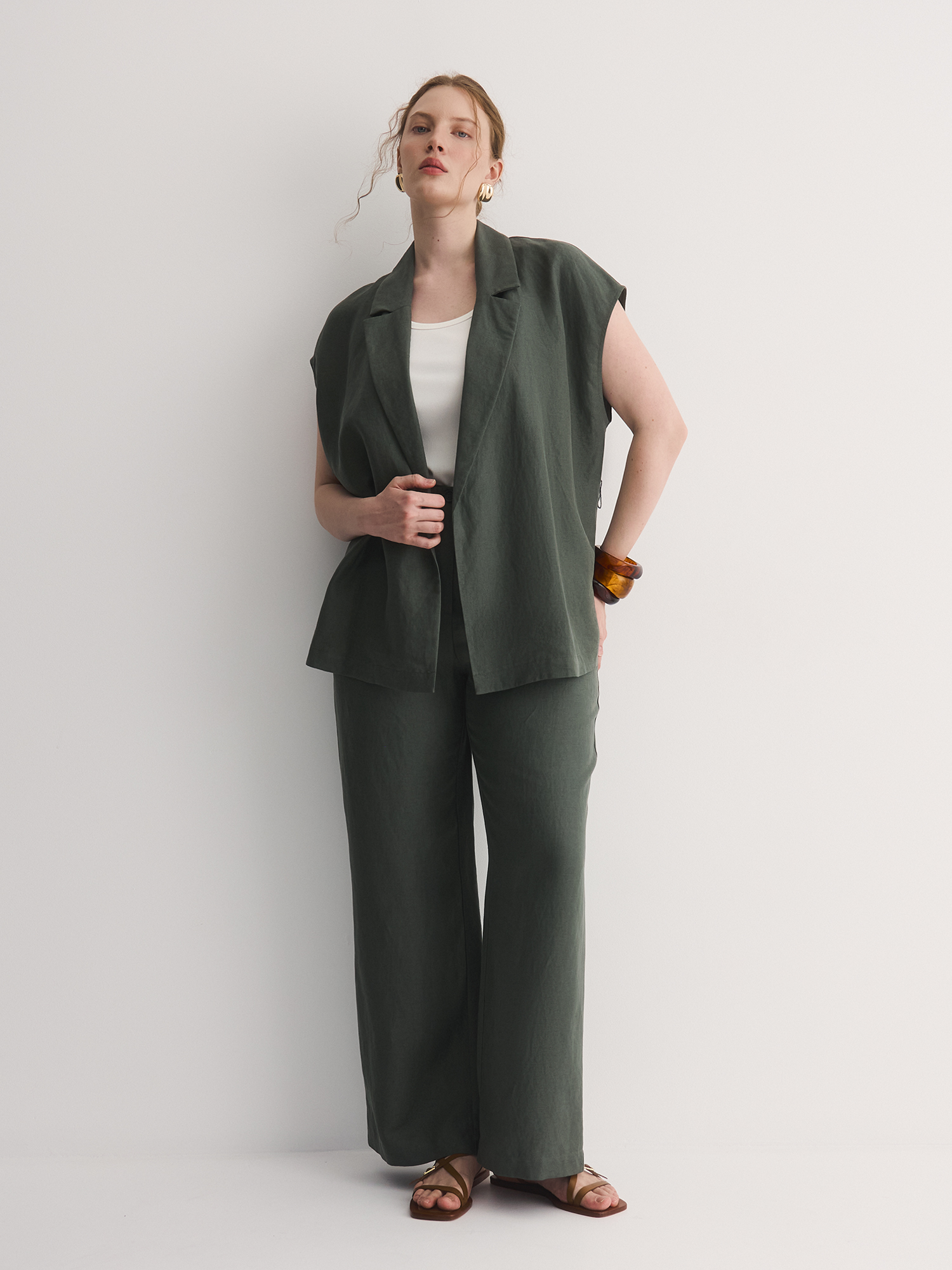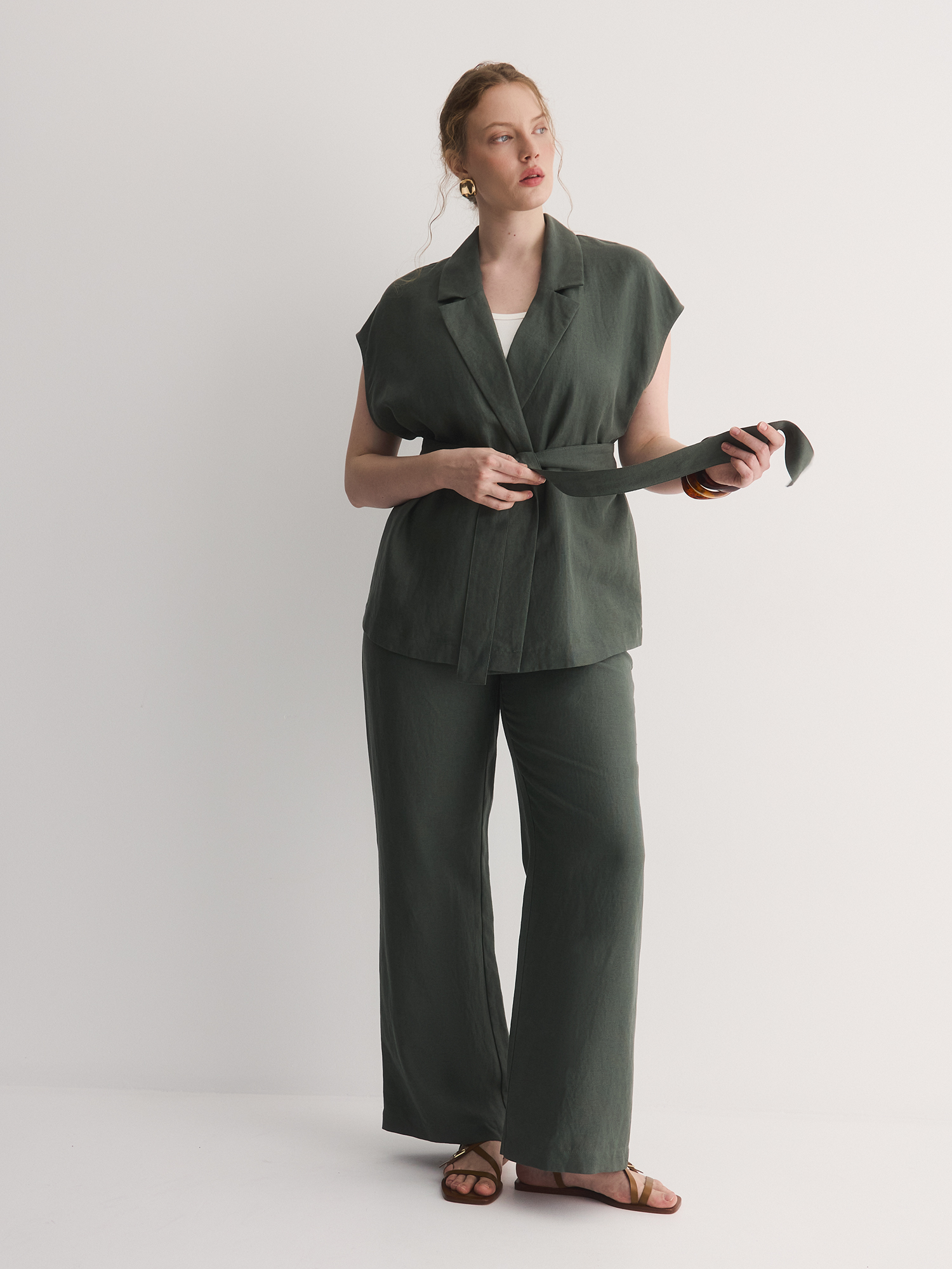 Жилет лесного зеленого цвета – идеальное сочетание стиля и комфорта. Сшитый из натурального льна и шелковистого лиоцелла, он легкий, дышащий и приятный к телу, поддерживает комфортную температуру.