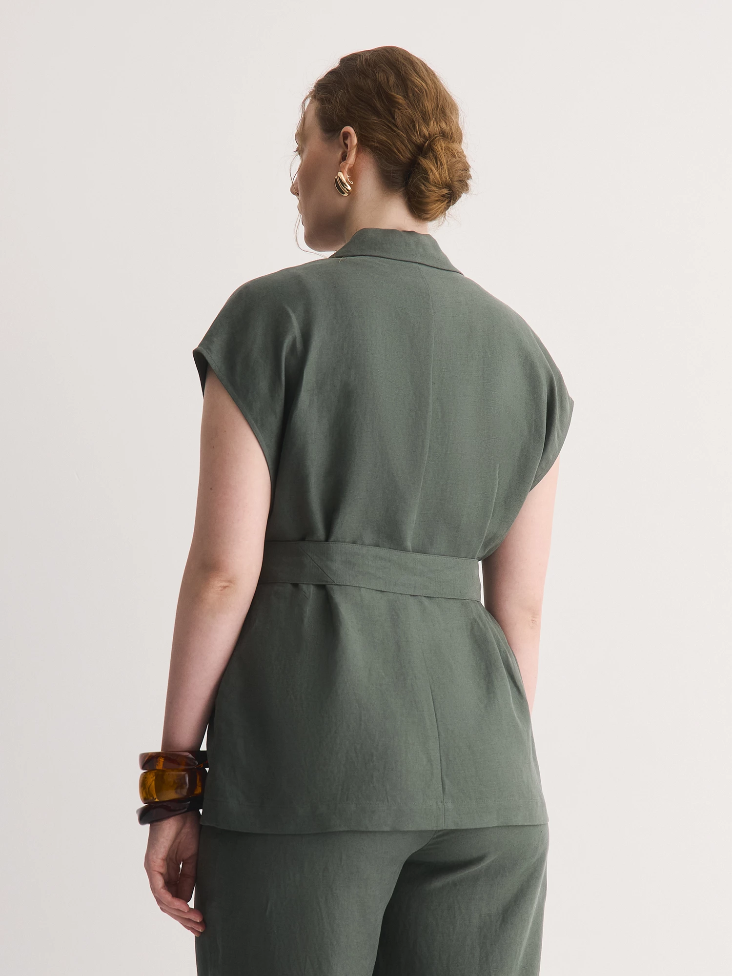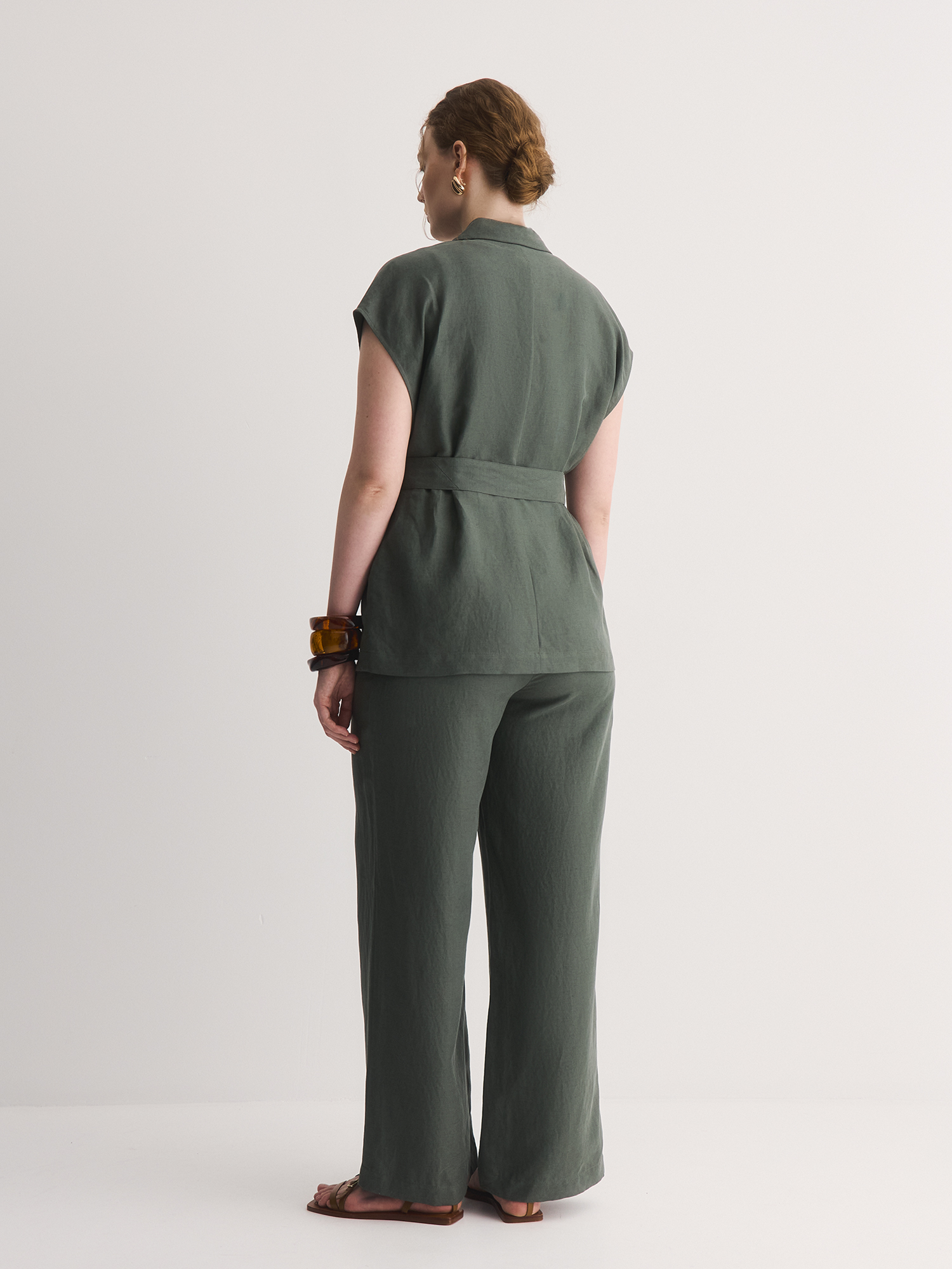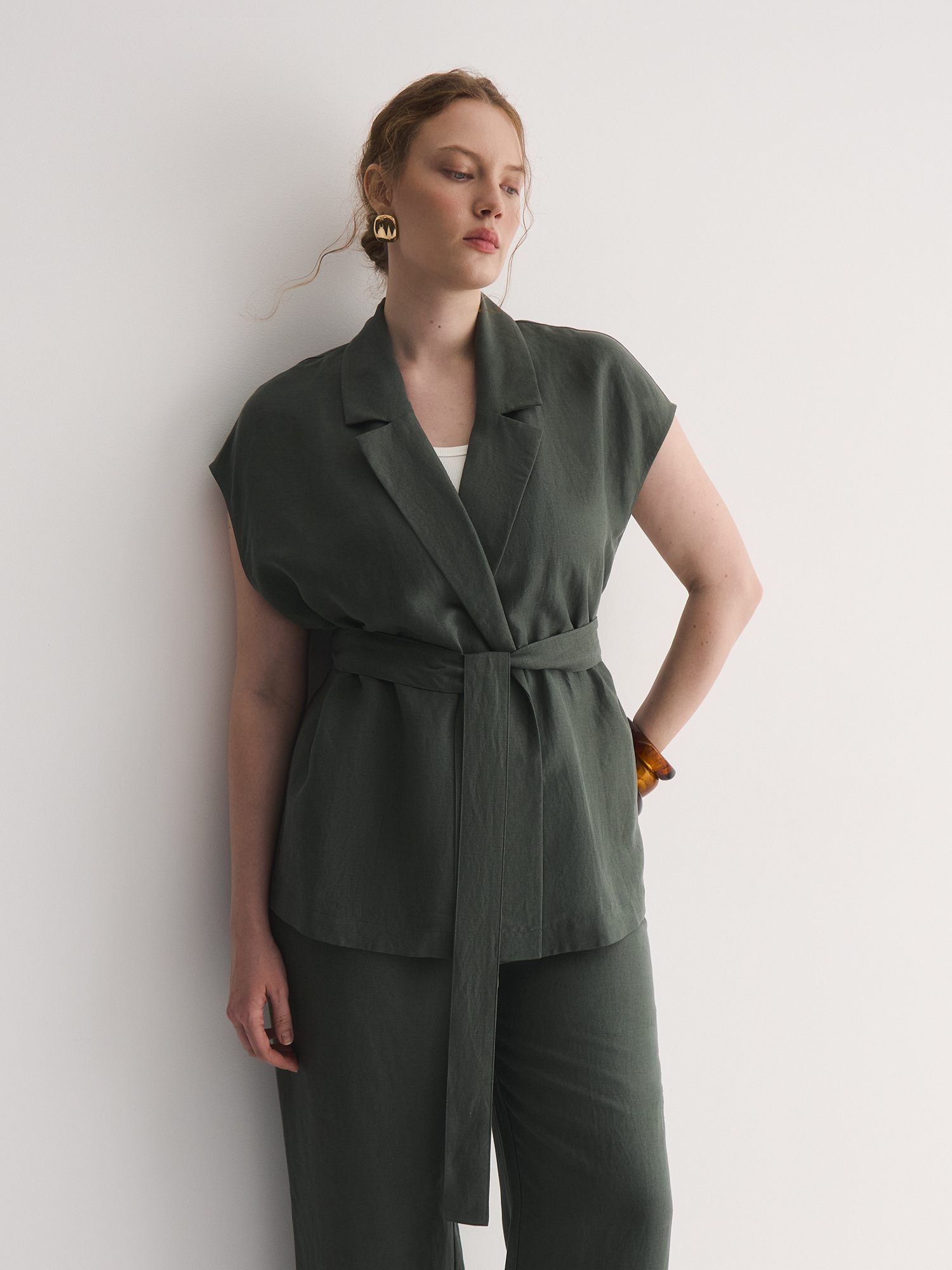 Жилет лесного зеленого цвета – идеальное сочетание стиля и комфорта. Сшитый из натурального льна и шелковистого лиоцелла, он легкий, дышащий и приятный к телу, поддерживает комфортную температуру.
