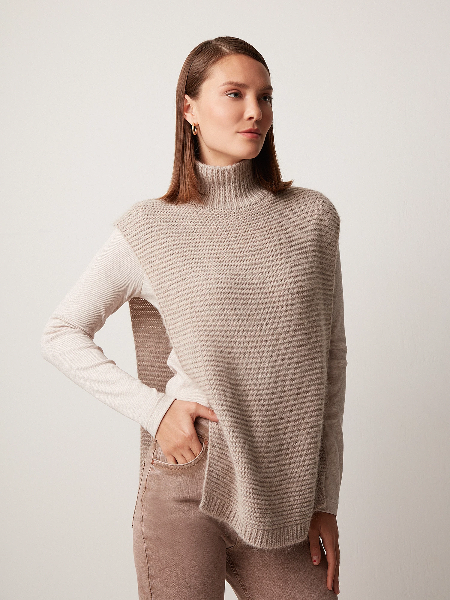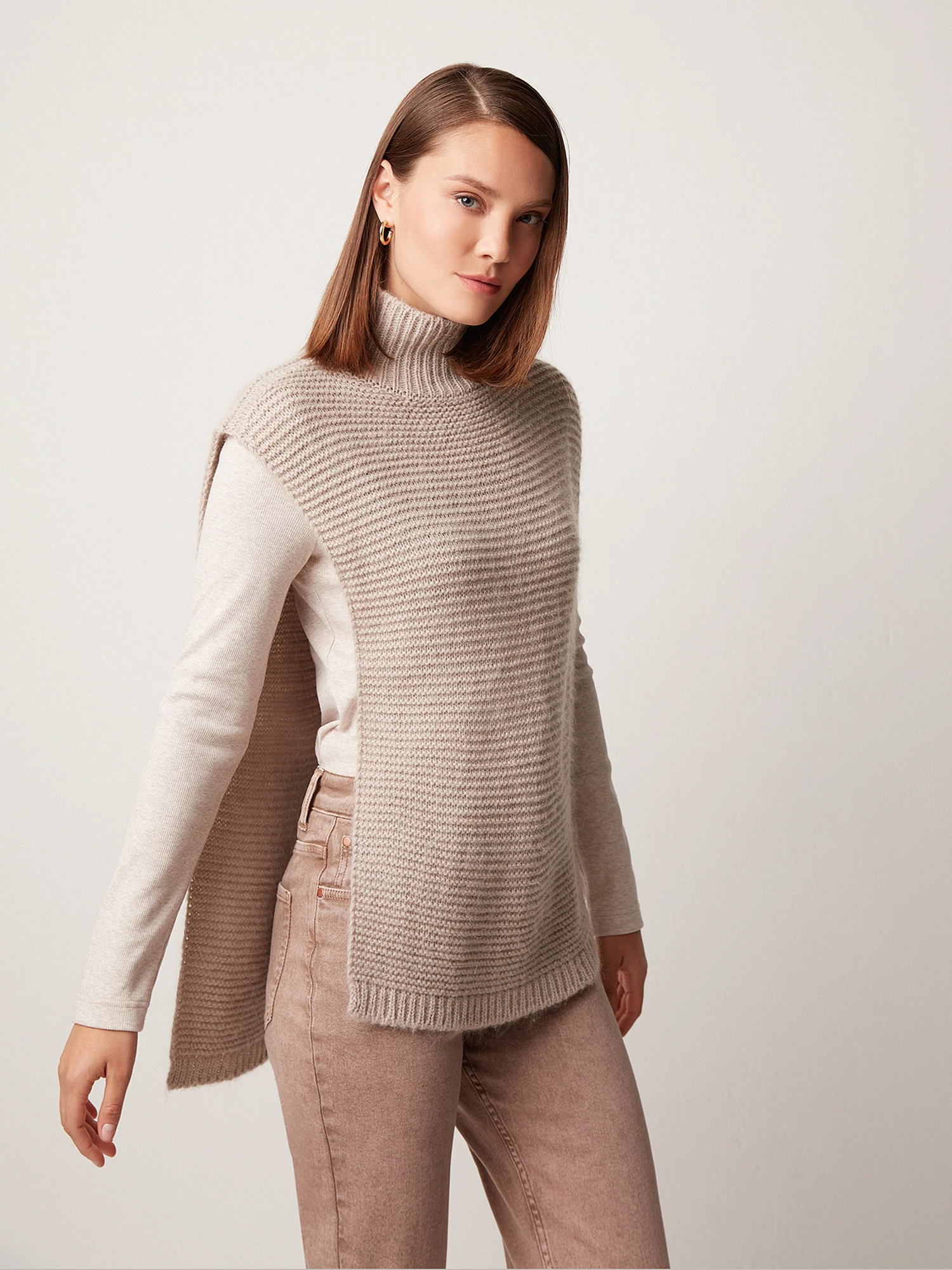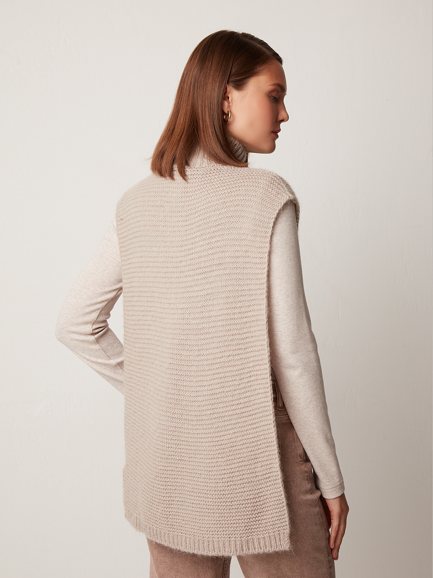 Фактурный жилет крупной вязки оттенка трюфель. Выполнен из фирменной пряжи с добавлением натуральной шерсти, мягкий материал хорошо сохраняет тепло. Модель прямого силуэта, без боковых швов, с высоким воротником стойкой в крупный рубчик и манжетом по низу изделия. Вязаный уютный жилет дополнит как лук в стиле кэжуал, так и станет незаменим в качестве теплого слоя под верхнюю одежду.