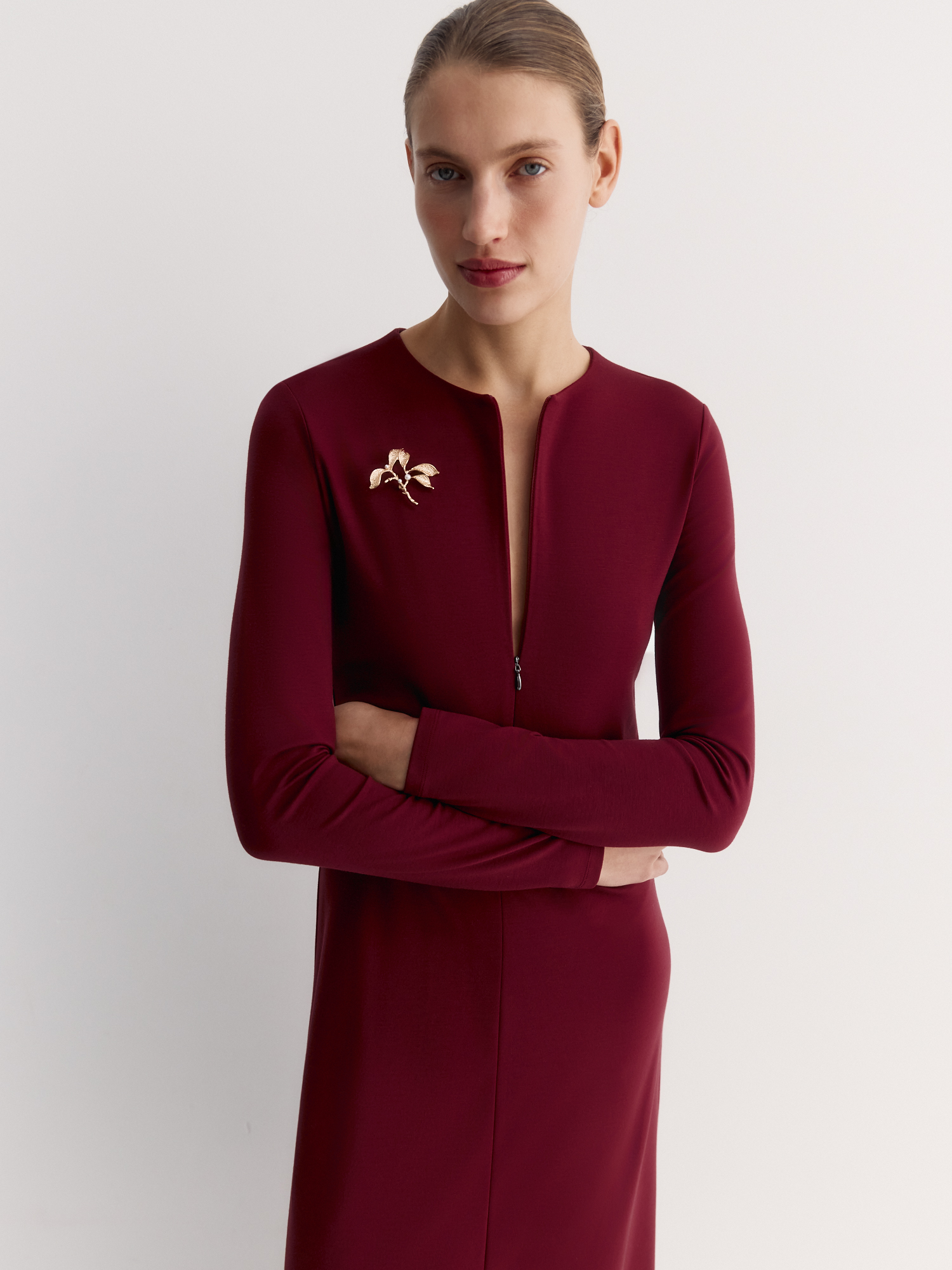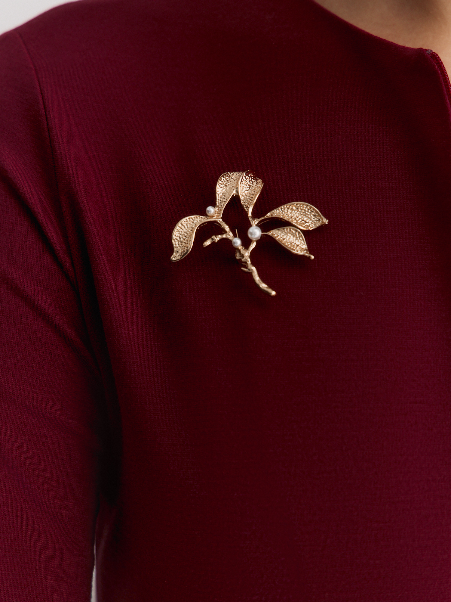 Золотистая брошь в виде ветки с каплями росы символизирует свежесть и природную гармонию. Она прочная и красиво переливается на свету благодаря объёмному рельефу.