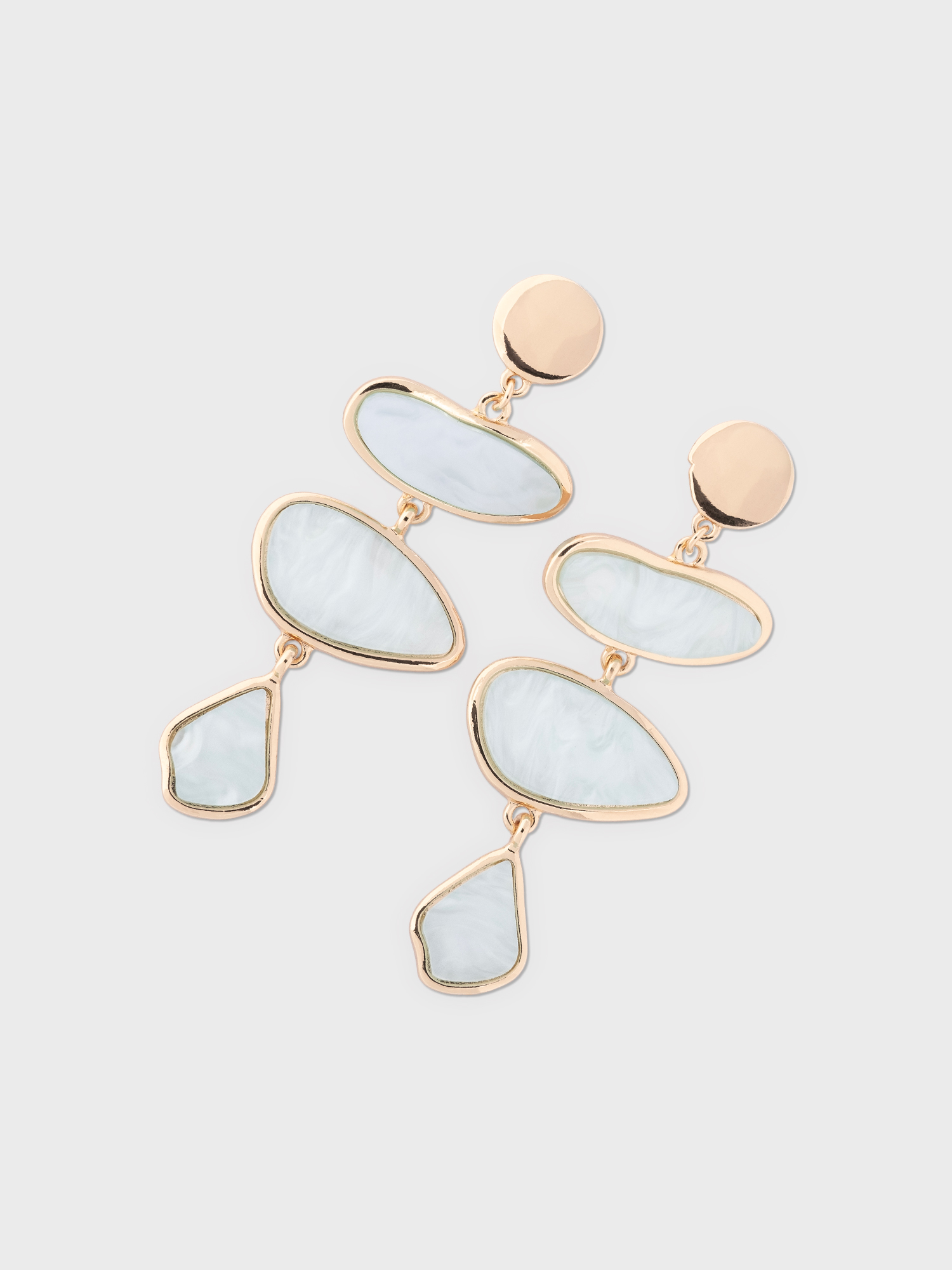 Серьги из трёх золотистых звеньев цинка украшены инкрустацией из голубой эпоксидной смолы. Они прочные, не царапаются и имеют гладкую глянцевую поверхность.